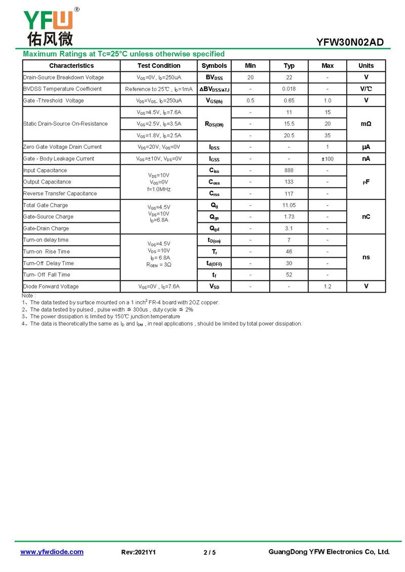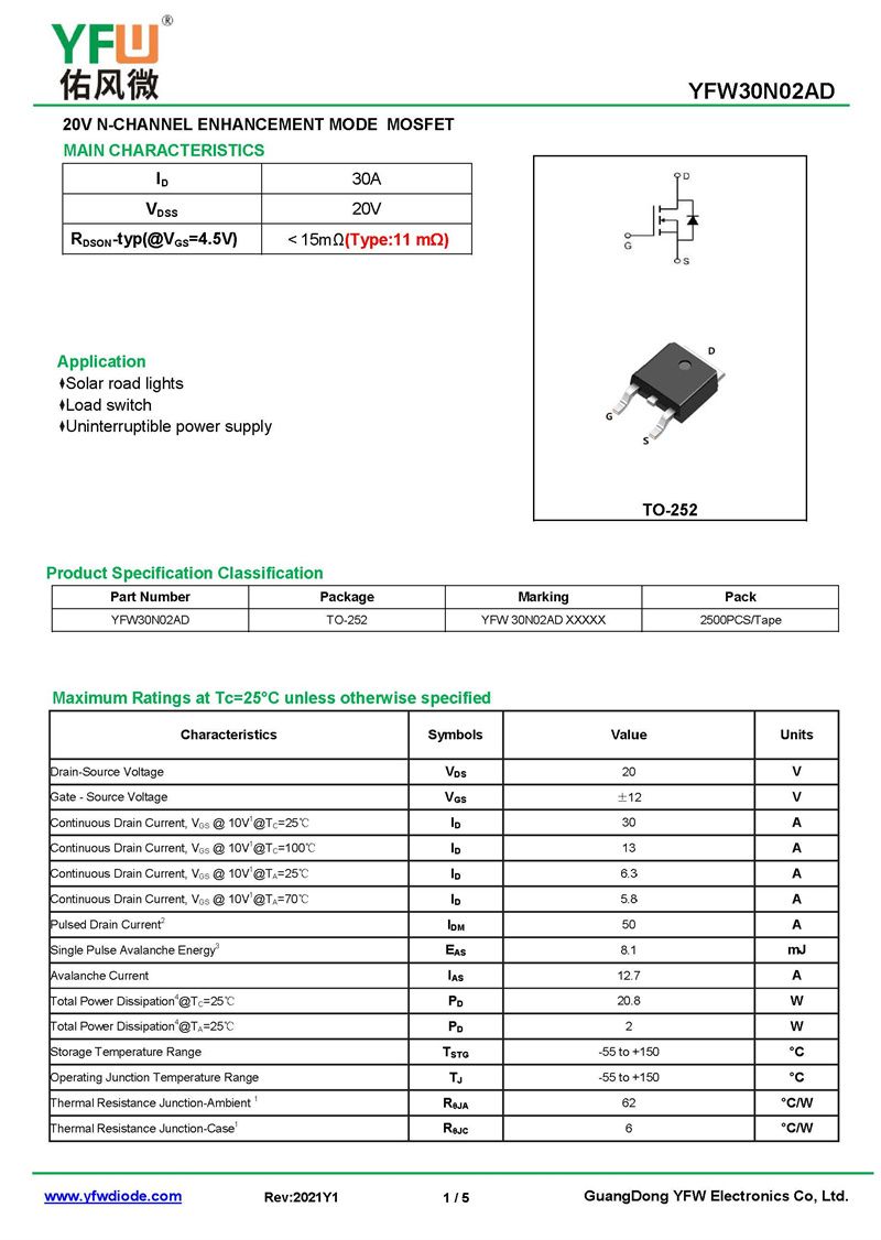 P溝MOS管YFW30N02AD 規格書_價格_PDF手冊-廣東佑風微原廠YFW30N02AD TO-252_(YFW佑風微)品牌