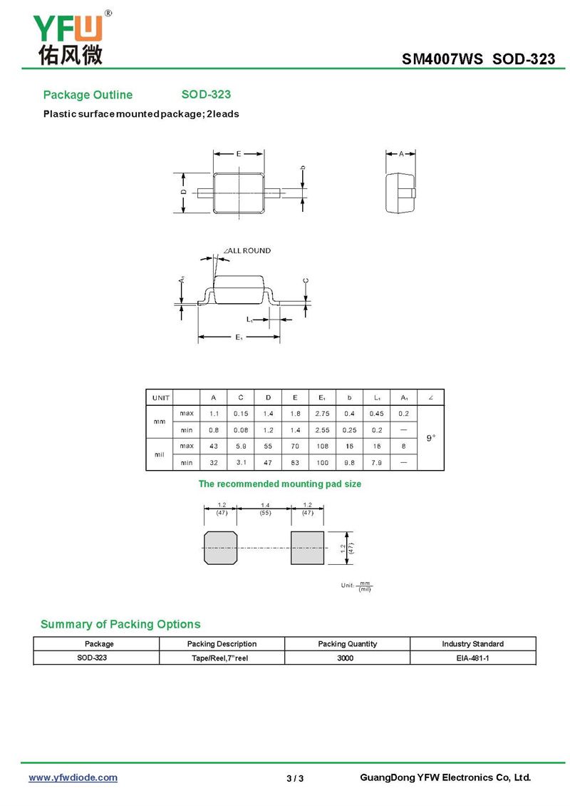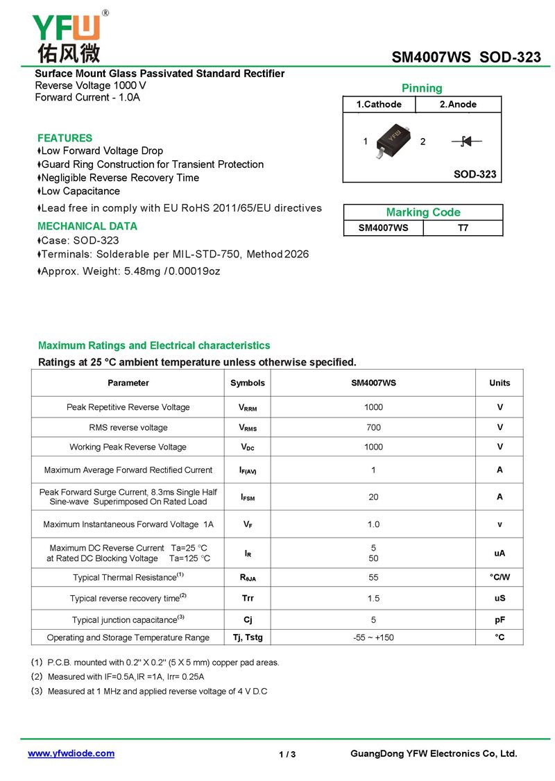 標準整流器 SM4007WS 規格書_價格_PDF手冊-廣東佑風微原廠SM4007WS SOD-323_(YFW佑風微)品牌