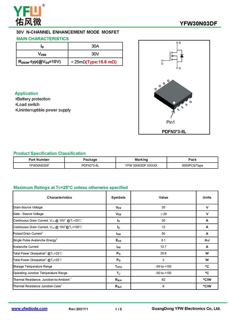 場效應管YFW30N03DF 規格書_價格_PDF手冊-廣東佑風微原廠YFW30N03DF PDFN3*3-8L_(YFW佑風微)品牌