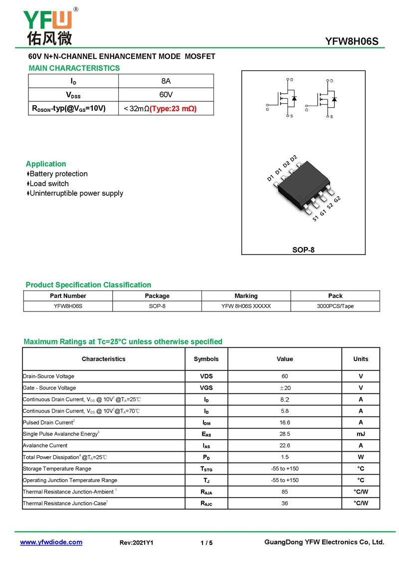 場效應管YFW8H06S 規格書_價格_PDF手冊-廣東佑風微原廠YFW8H06S SOP-8_(YFW佑風微)品牌