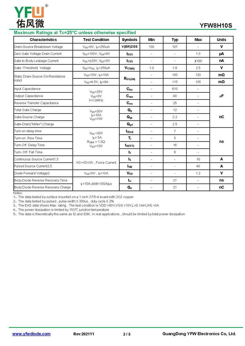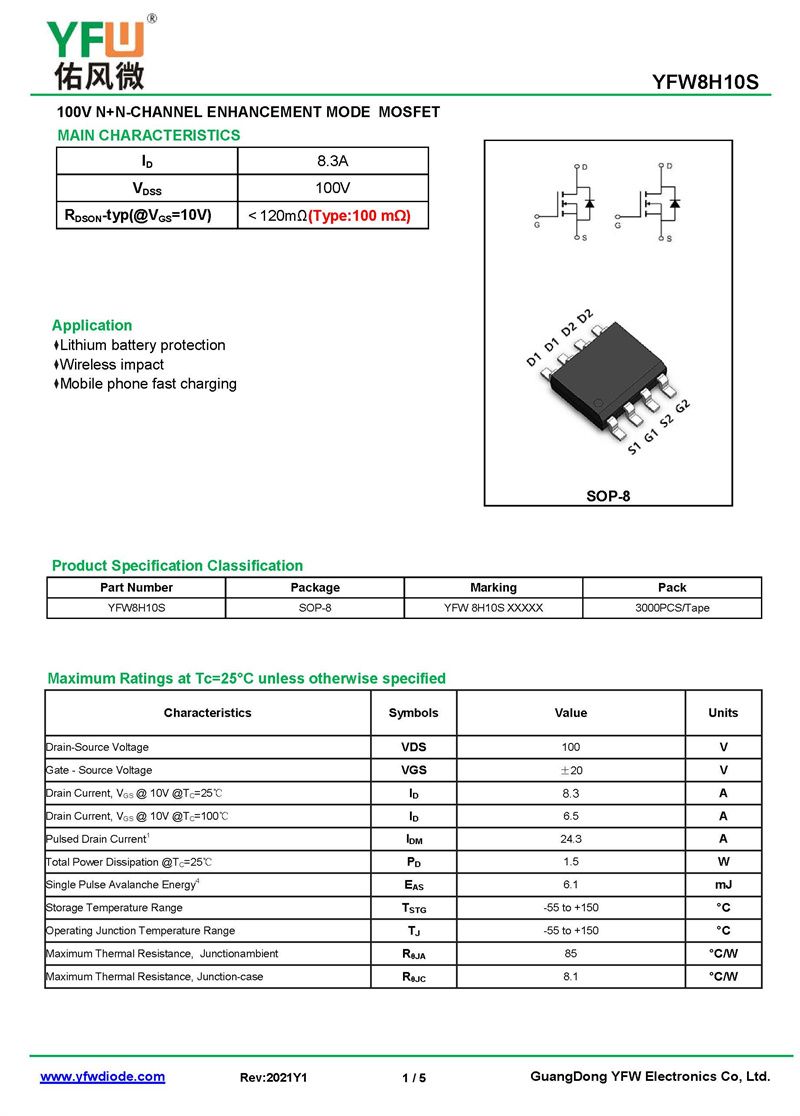 場效應管YFW8H10S 規格書_價格_PDF手冊-廣東佑風微原廠YFW8H10S SOP-8_(YFW佑風微)品牌