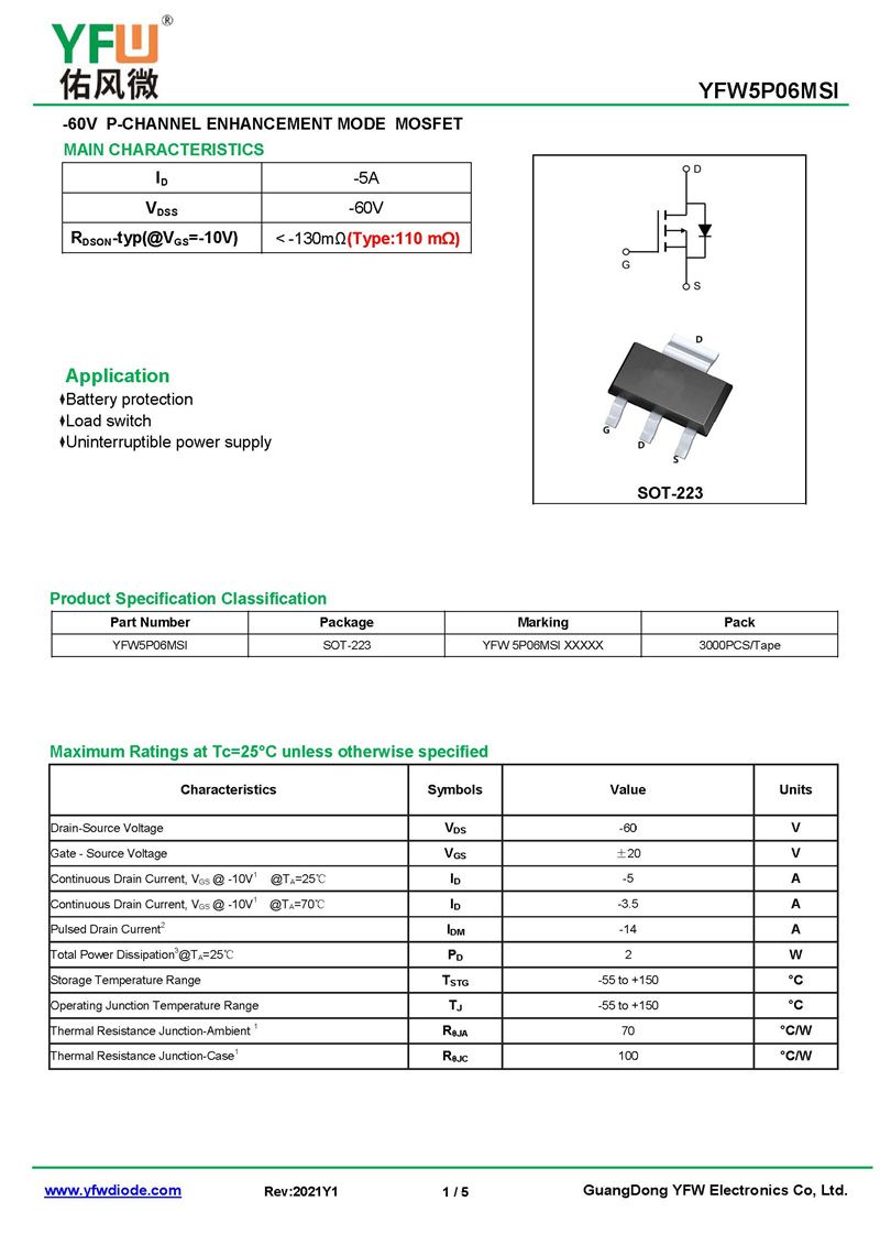 場效應管YFW5P06MSI 規格書_價格_PDF手冊-廣東佑風微原廠YFW5P06MSI SOT-223_(YFW佑風微)品牌