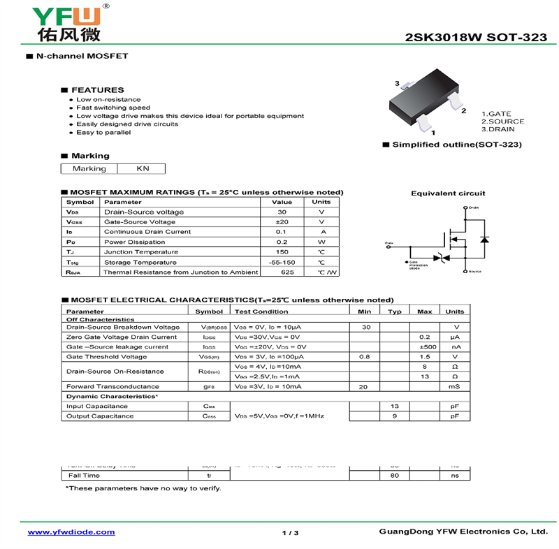 場效應管2SK3018W 規格書_價格_PDF手冊-廣東佑風微原廠2SK3018W SOT-323_(YFW佑風微)品牌