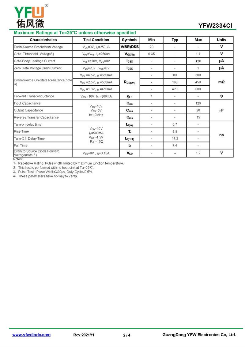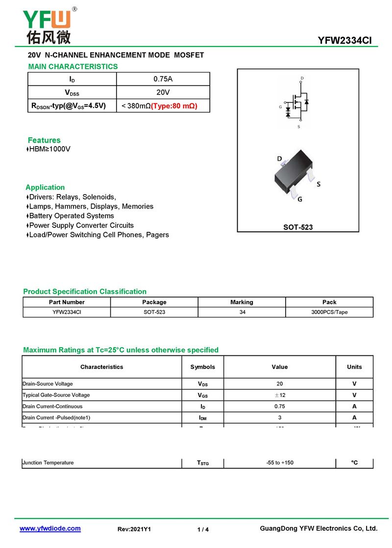 場效應管YFW2334CI 規格書_價格_PDF手冊-廣東佑風微原廠YFW2334CI SOT-523_(YFW佑風微)品牌