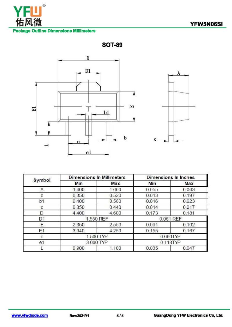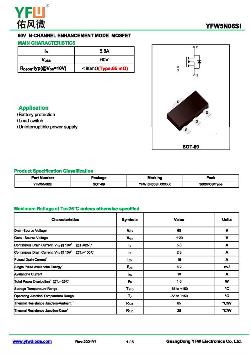 場效應管YFW5N06SI 規格書_價格_PDF手冊-廣東佑風微原廠YFW5N06SI SOT-89_(YFW佑風微)品牌