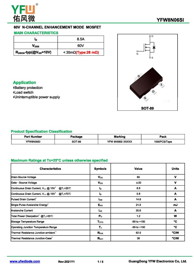 場效應管YFW8N06SI 規格書_價格_PDF手冊-廣東佑風微原廠YFW8N06SI SOT-89_(YFW佑風微)品牌