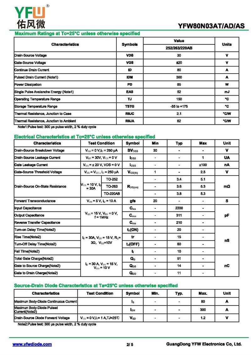 場效應管YFW80N03AT 規格書_價格_PDF手冊-廣東佑風微原廠YFW80N03AT TO-220AB_(YFW佑風微)品牌