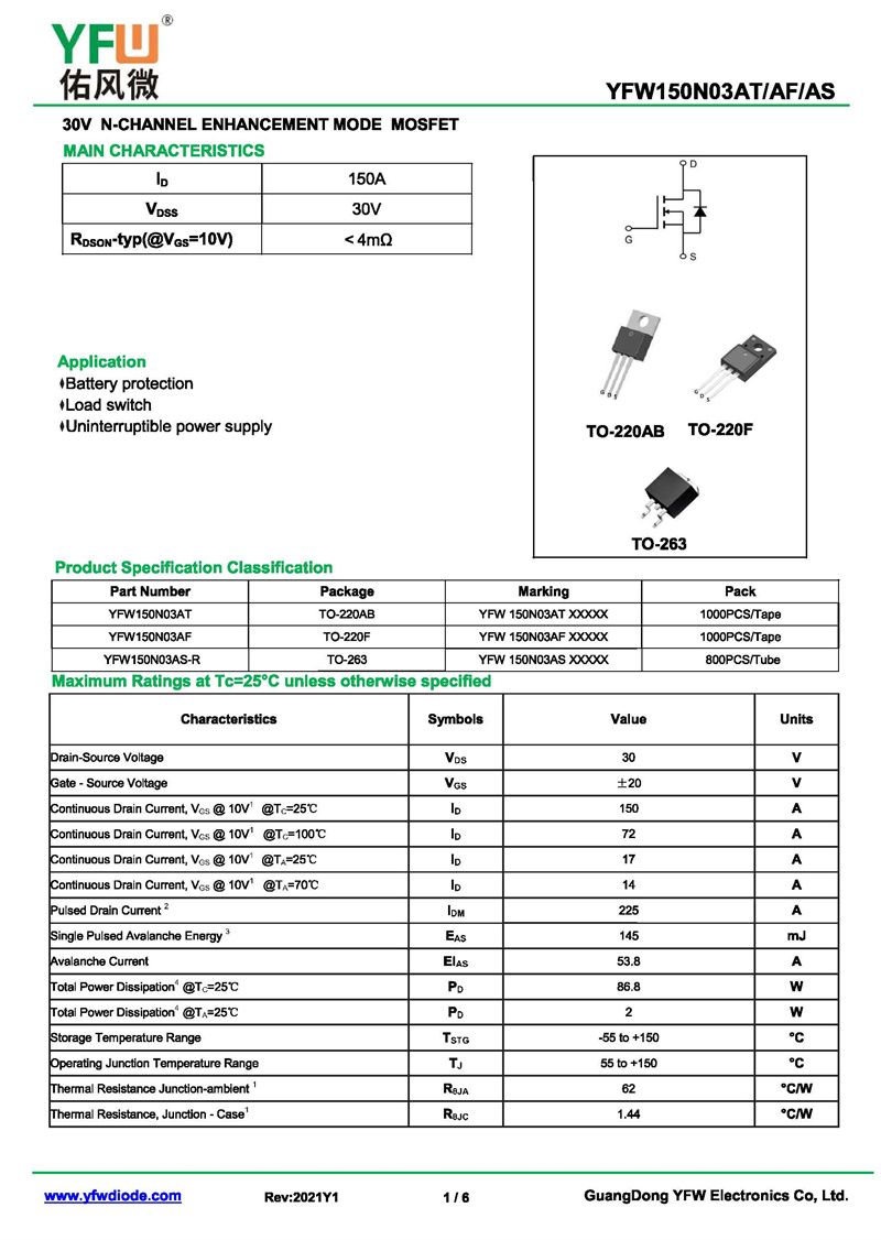 場效應管YFW150N03AT 規格書_價格_PDF手冊-廣東佑風微原廠YFW150N03AT TO-220AB_(YFW佑風微)品牌