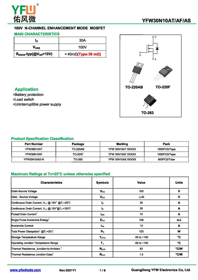 場效應管YFW30N10AT 規格書_價格_PDF手冊-廣東佑風微原廠YFW30N10AT TO-220AB_(YFW佑風微)品牌