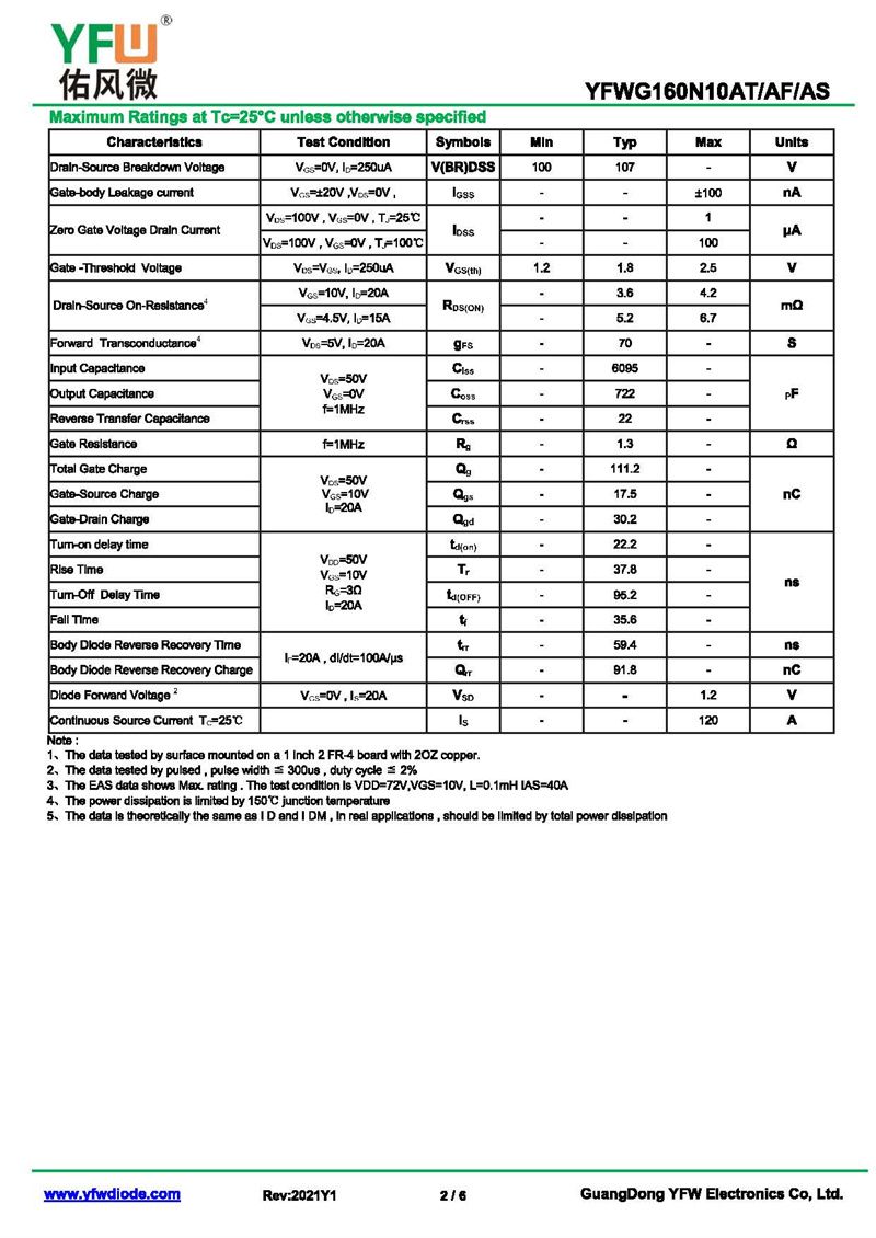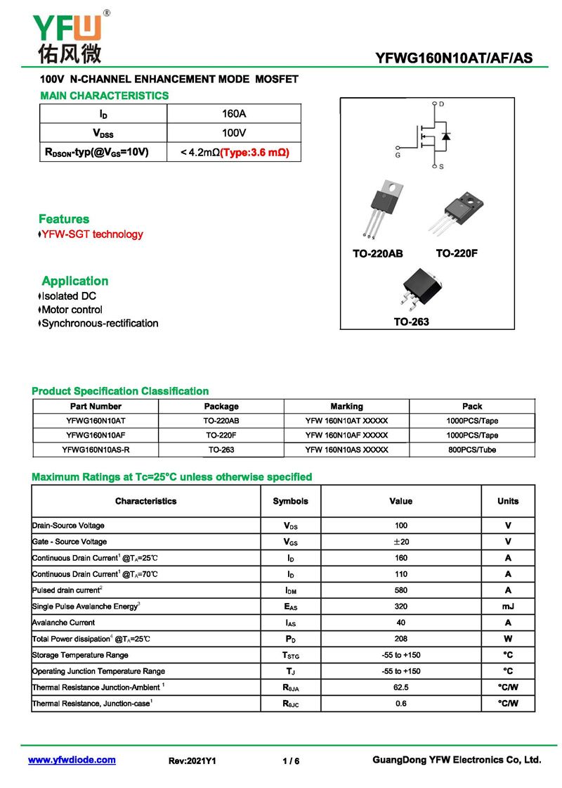 場效應管YFWG160N10AT 規格書_價格_PDF手冊-廣東佑風微原廠YFWG160N10AT TO-220AB_(YFW佑風微)品牌