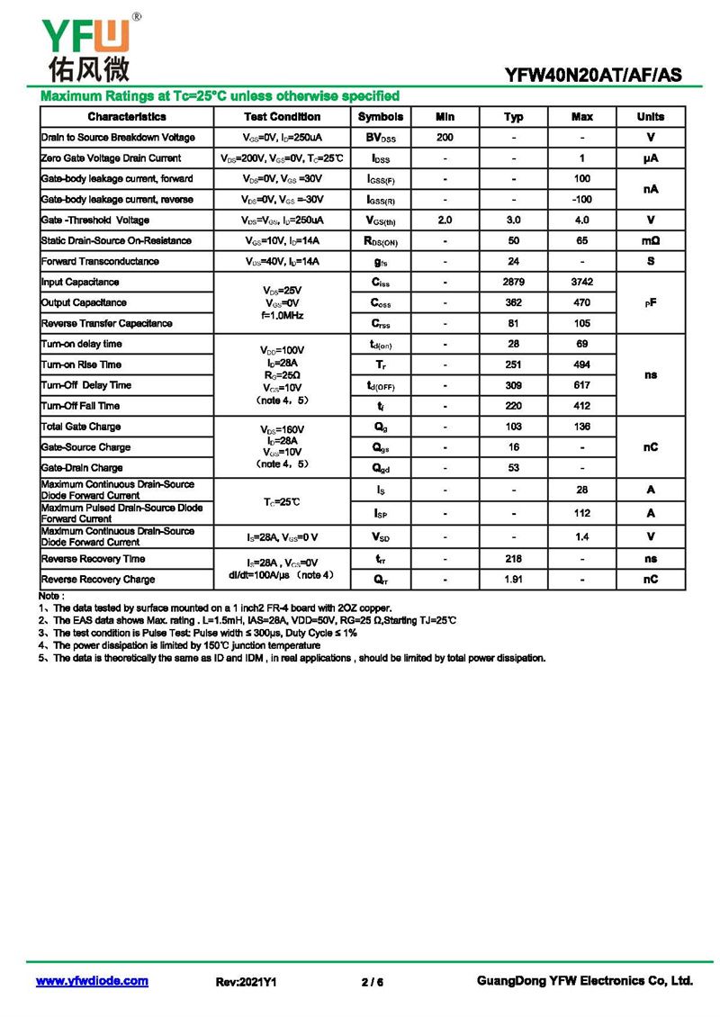 場效應管YFW40N20AT 規格書_價格_PDF手冊-廣東佑風微原廠YFW40N20AT TO-220AB_(YFW佑風微)品牌