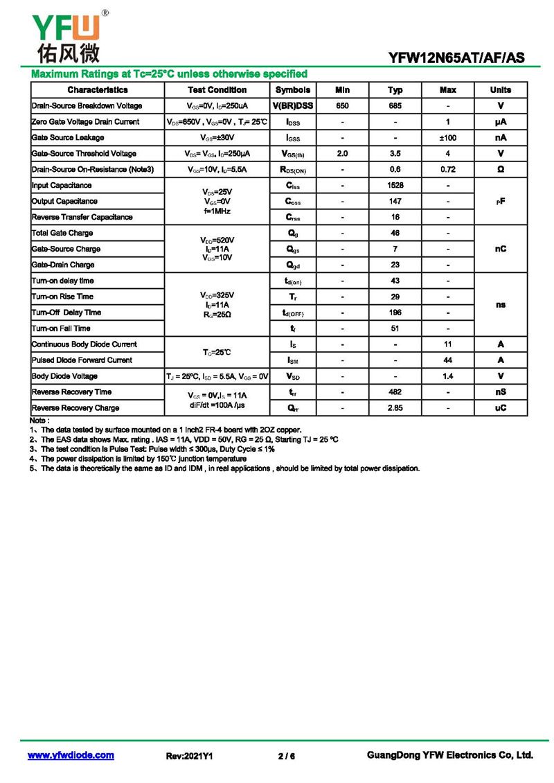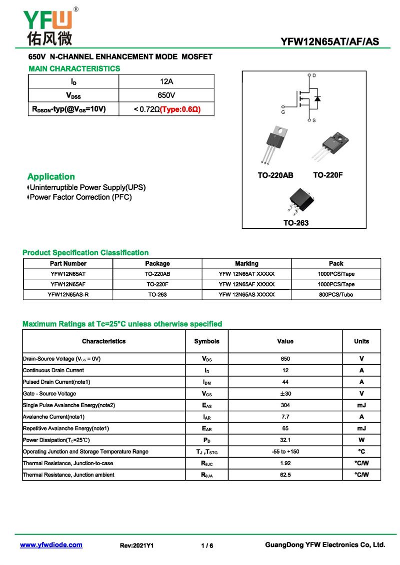 場(chǎng)效應(yīng)管YFW12N65AT 規(guī)格書(shū)_價(jià)格_PDF手冊(cè)-廣東佑風(fēng)微原廠YFW12N65AT TO-220AB_(YFW佑風(fēng)微)品牌