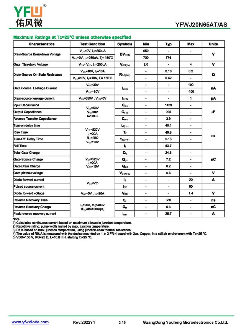 場效應管YFWJ20N65AT 規格書_價格_PDF手冊-廣東佑風微原廠YFWJ20N65AT TO-220AB_(YFW佑風微)品牌