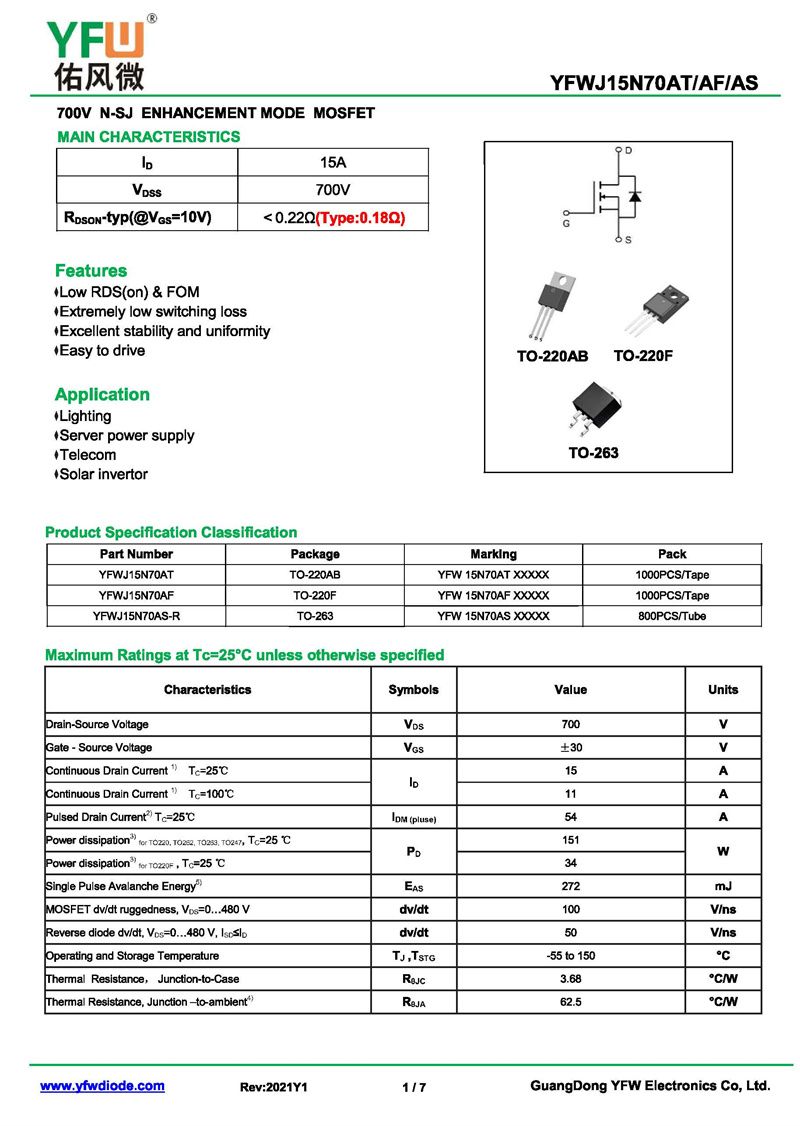 場效應管YFWJ15N70AT 規格書_價格_PDF手冊-廣東佑風微原廠YFWJ15N70AT TO-220AB_(YFW佑風微)品牌