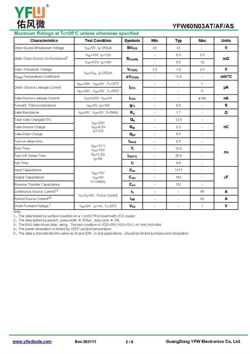 場效應管YFW60N03AF 規格書_價格_PDF手冊-廣東佑風微原廠YFW60N03AF TO-220F_(YFW佑風微)品牌