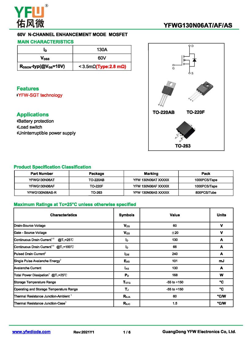 場效應管YFWG130N06AF 規(guī)格書_價格_PDF手冊-廣東佑風微原廠YFWG130N06AF TO-220F_(YFW佑風微)品牌