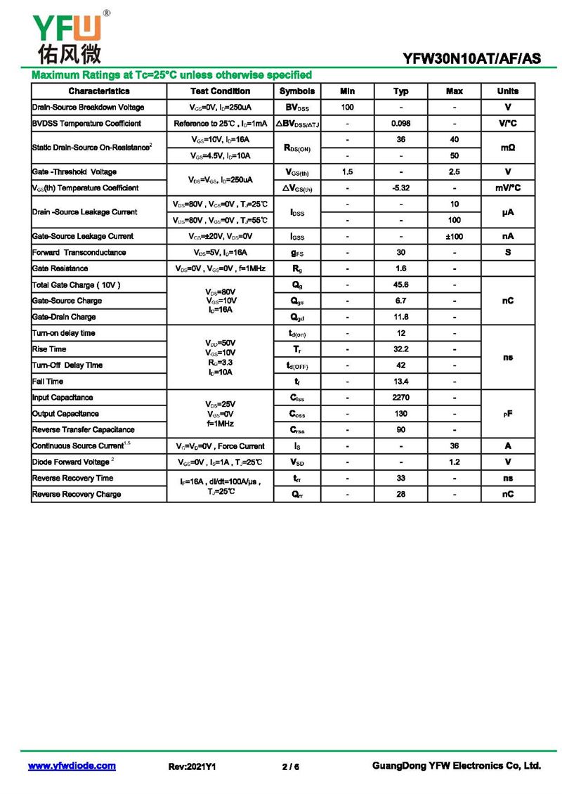 場效應管YFW30N10AF 規格書_價格_PDF手冊-廣東佑風微原廠YFW30N10AF TO-220F_(YFW佑風微)品牌