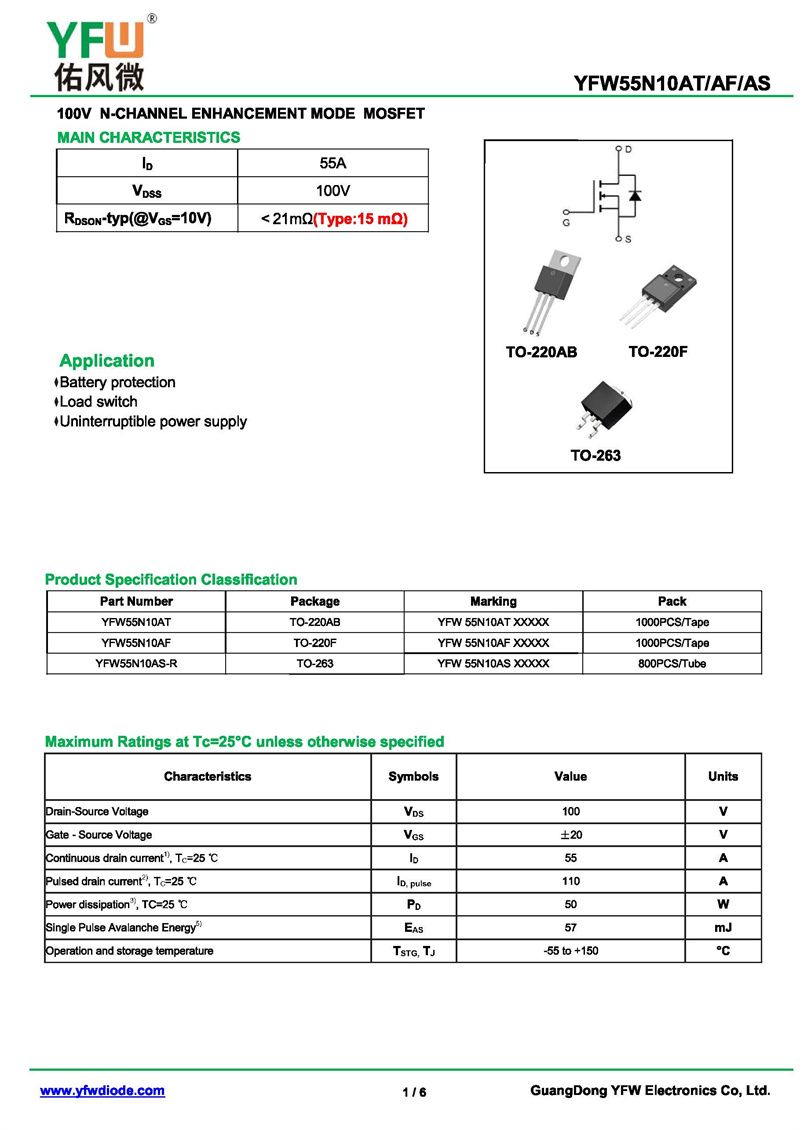 場效應管YFW55N10AF 規格書_價格_PDF手冊-廣東佑風微原廠YFW55N10AF TO-220F_(YFW佑風微)品牌