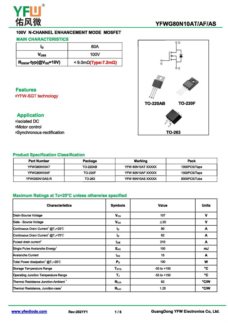 場效應管YFWG80N10A 規格書_價格_PDF手冊-廣東佑風微原廠YFWG80N10A TO-220F_(YFW佑風微)品牌