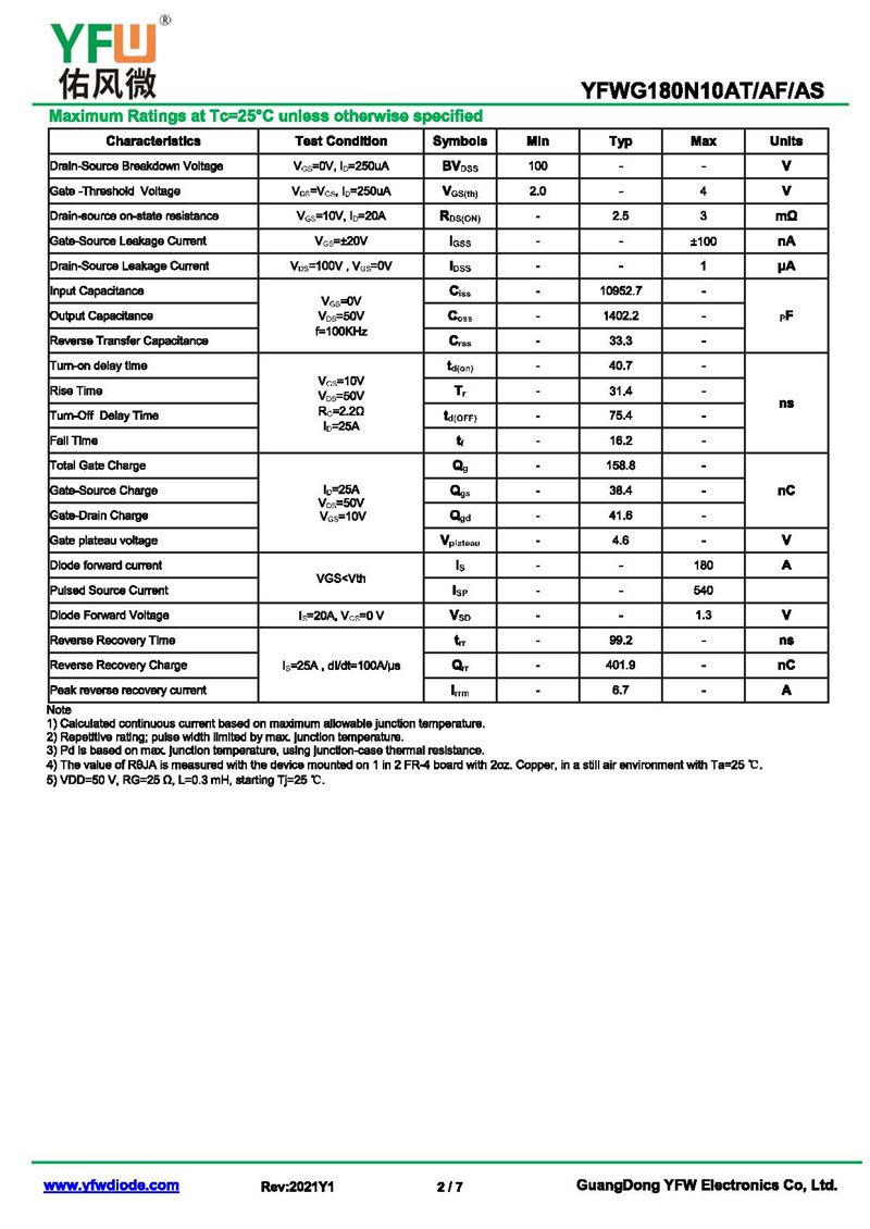 場效應管YFWG180N10AF 規格書_價格_PDF手冊-廣東佑風微原廠YFWG180N10AF TO-220F_(YFW佑風微)品牌