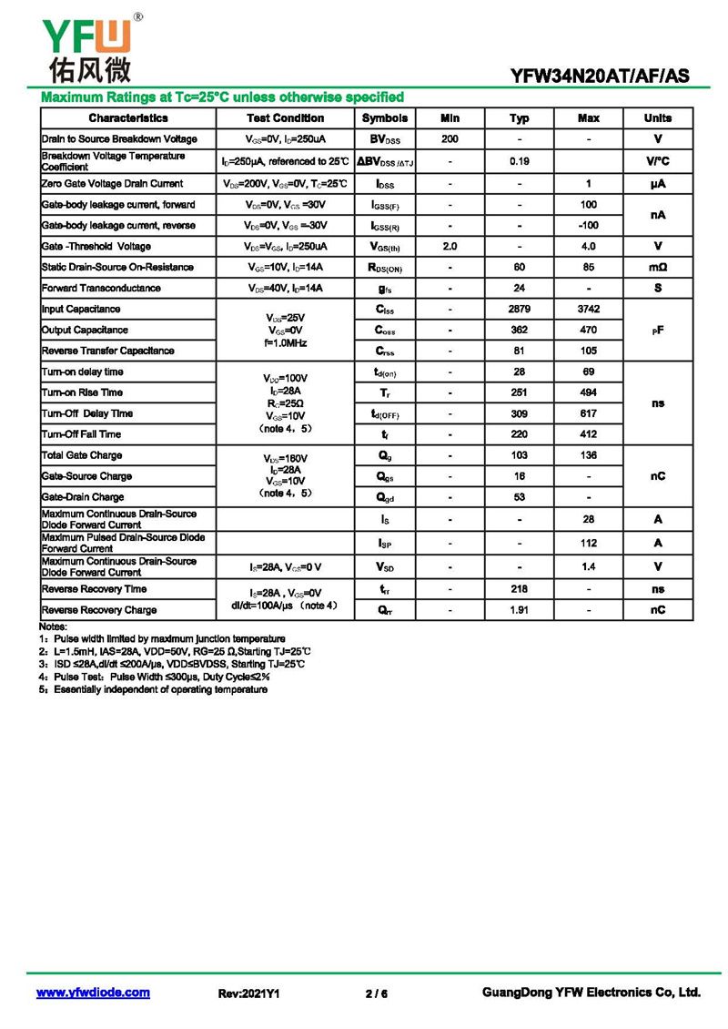 場效應管YFW34N20AF 規格書_價格_PDF手冊-廣東佑風微原廠YFW34N20AF TO-220F_(YFW佑風微)品牌