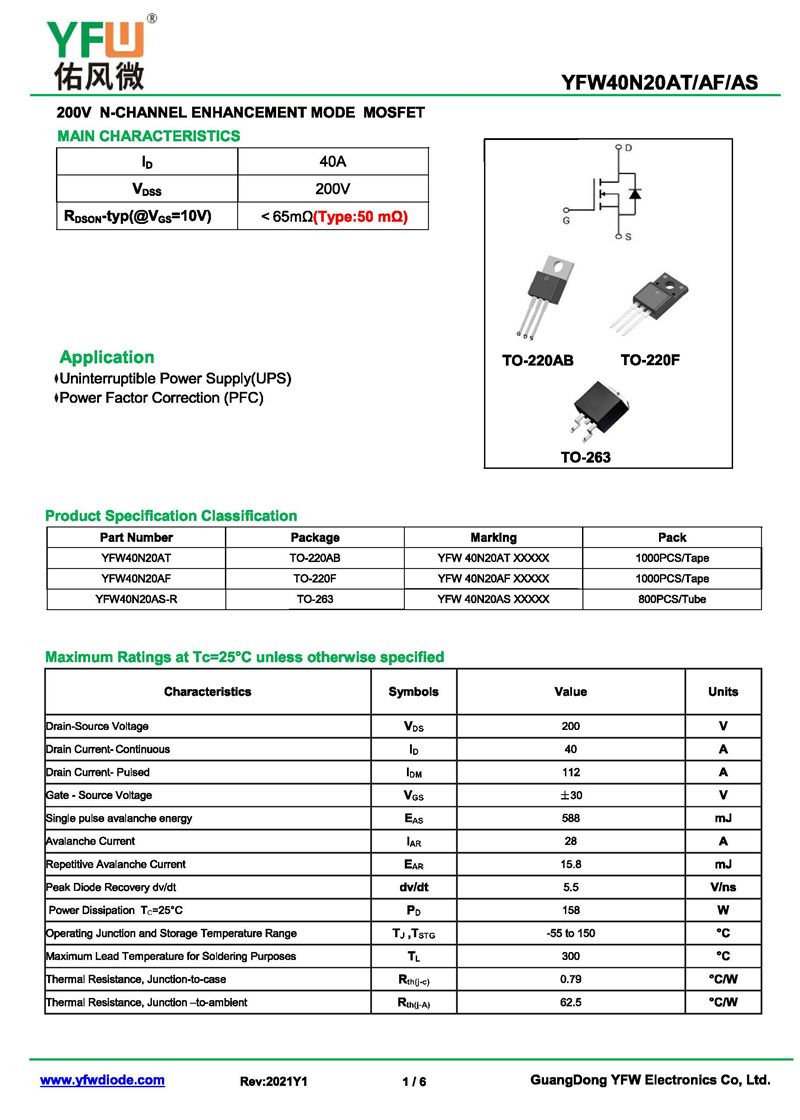 場效應管YFW40N20AF 規格書_價格_PDF手冊-廣東佑風微原廠YFW40N20AF TO-220F_(YFW佑風微)品牌