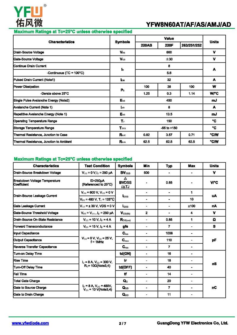 場效應(yīng)管YFW8N60AF 規(guī)格書_價(jià)格_PDF手冊-廣東佑風(fēng)微原廠YFW8N60AF TO-220F_(YFW佑風(fēng)微)品牌