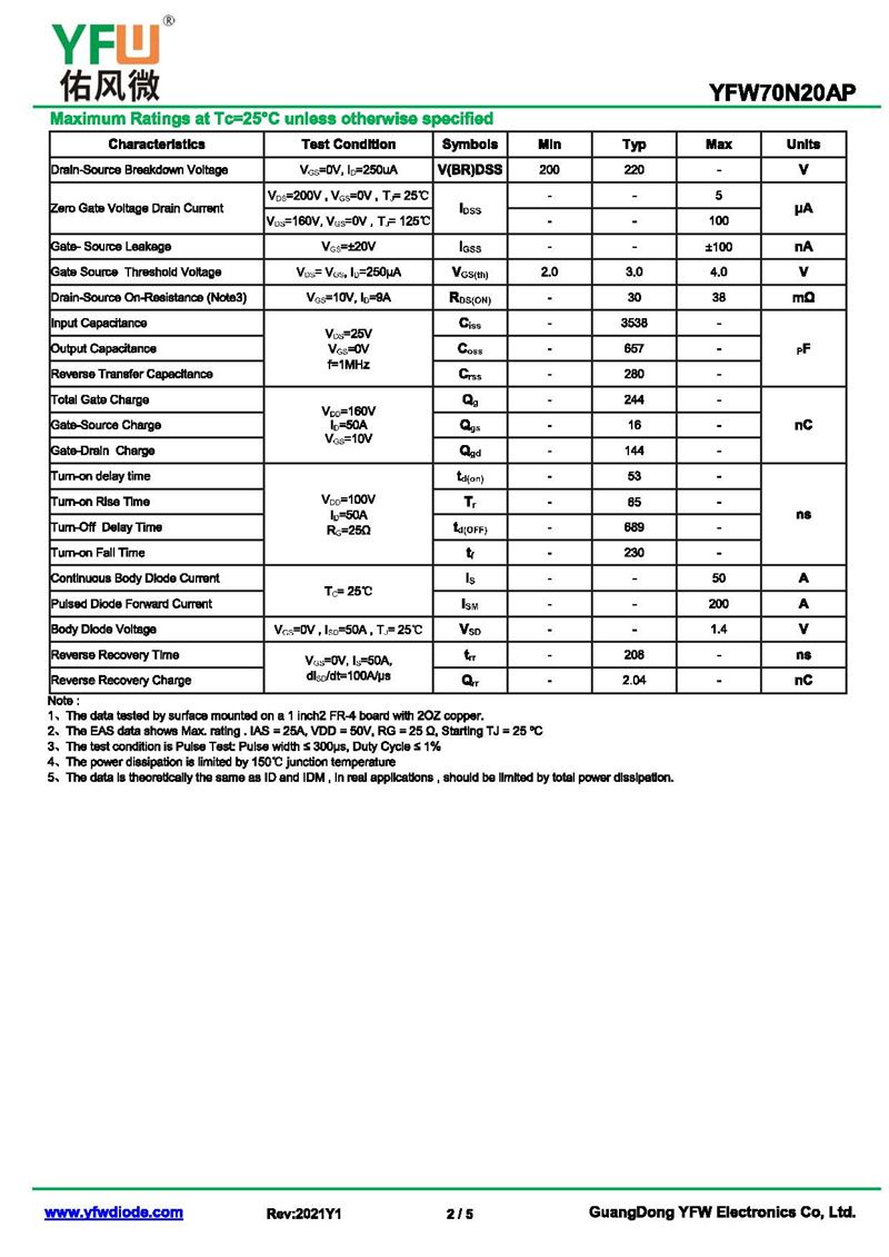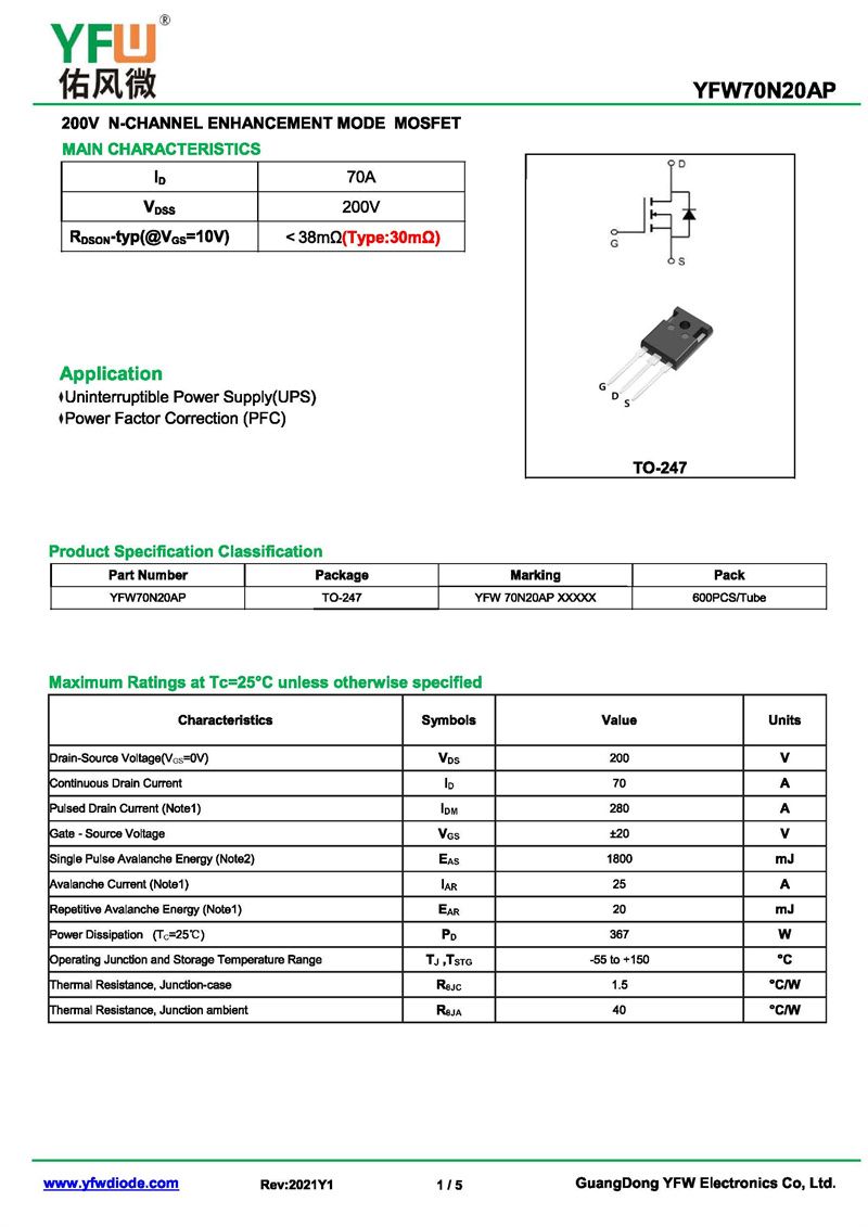 場效應管YFW70N20AP 規格書_價格_PDF手冊-廣東佑風微原廠YFW70N20AP TO-247_(YFW佑風微)品牌