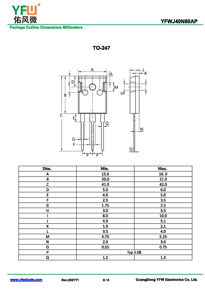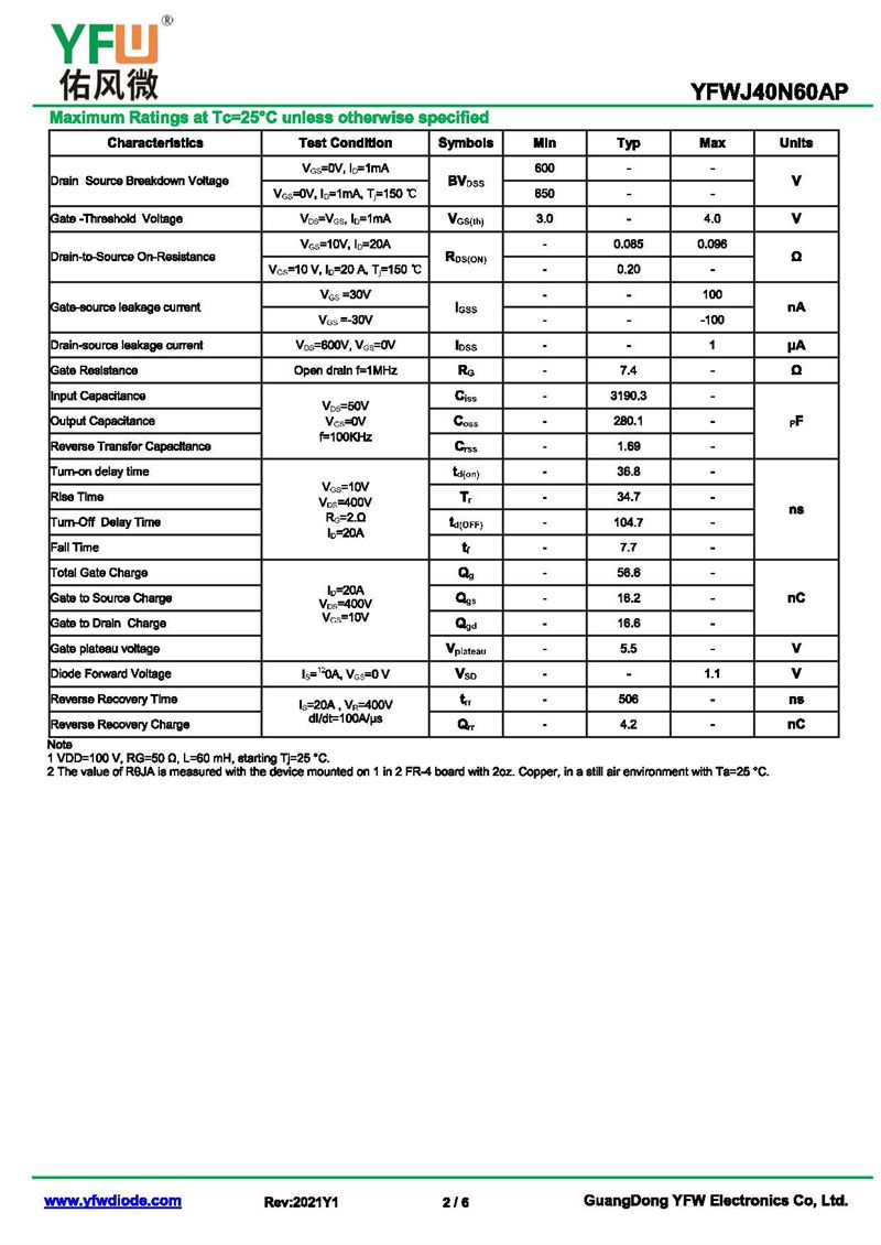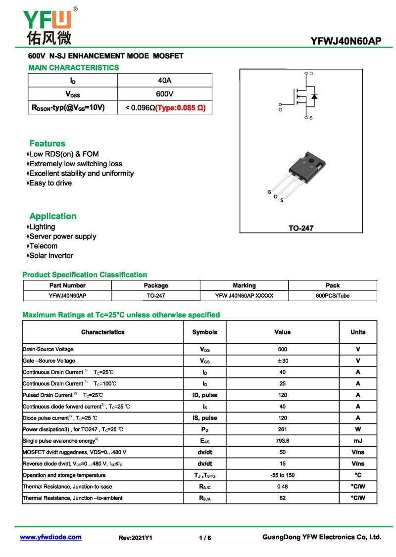 場效應管YFWJ40N60AP 規格書_價格_PDF手冊-廣東佑風微原廠YFWJ40N60AP TO-247_(YFW佑風微)品牌