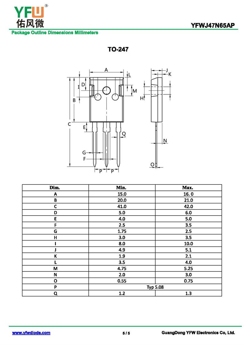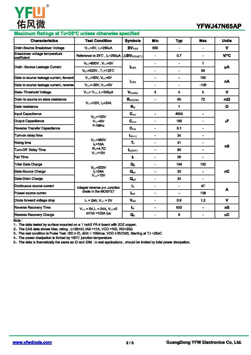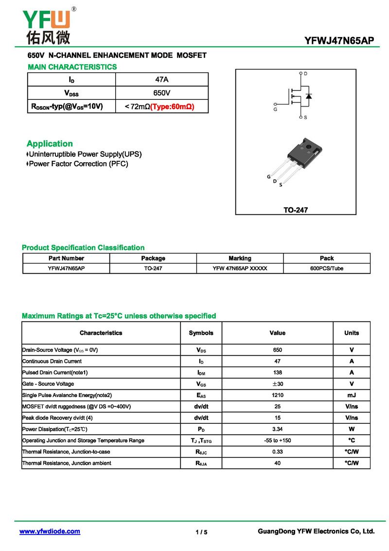 場效應管YFWJ47N65AP 規格書_價格_PDF手冊-廣東佑風微原廠YFWJ47N65AP TO-247_(YFW佑風微)品牌
