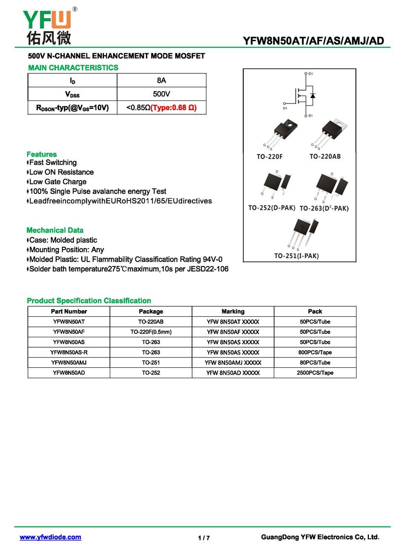 場效應管YFW8N50AMJ 規格書_價格_PDF手冊-廣東佑風微原廠YFW8N50AMJ TO-251_(YFW佑風微)品牌