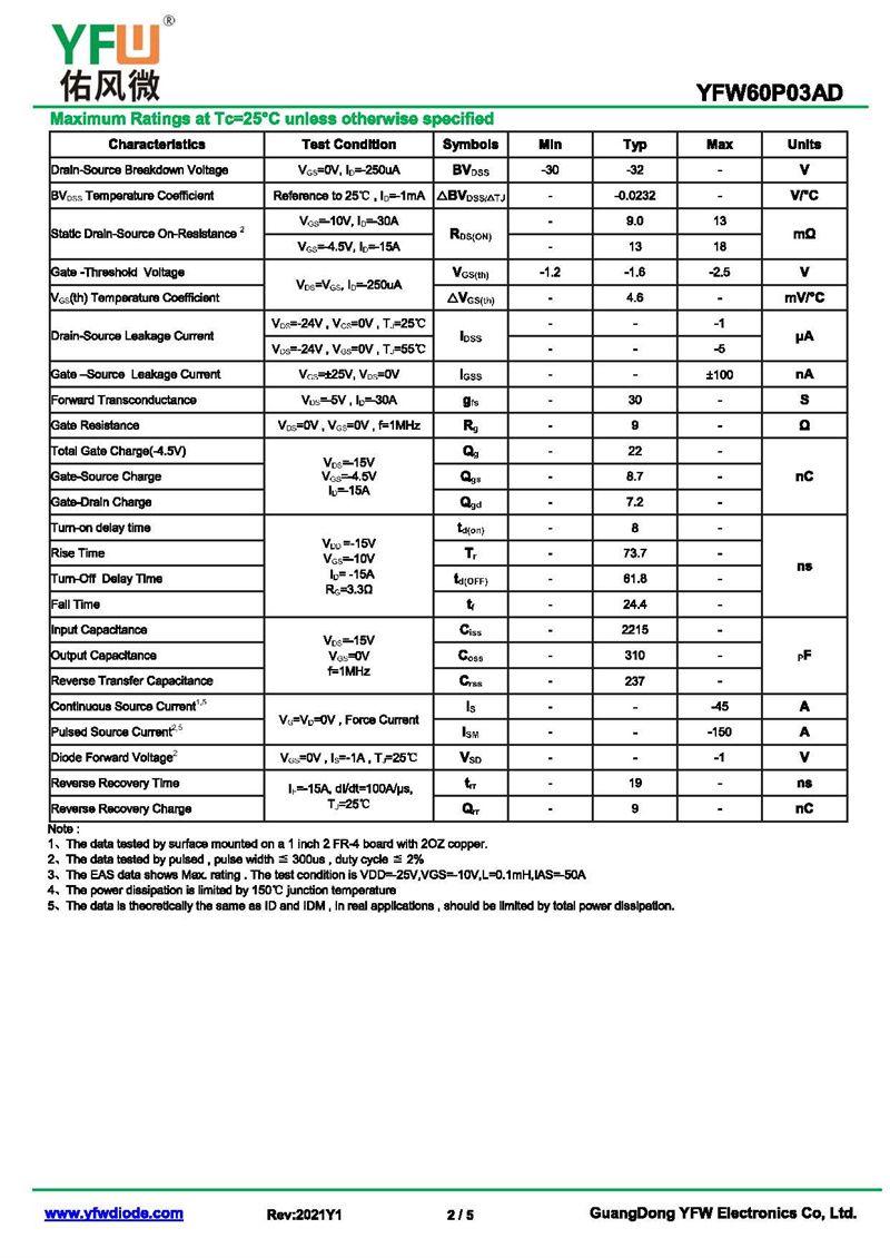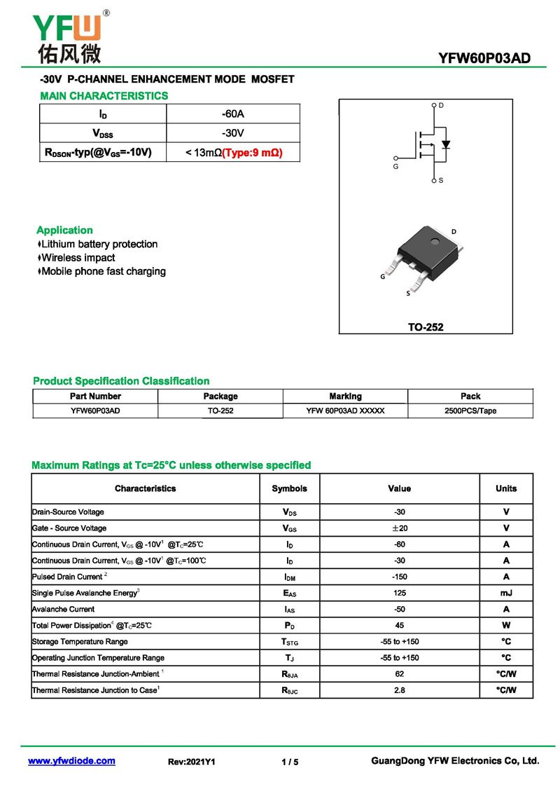 場效應管YFW60P03AD 規格書_價格_PDF手冊-廣東佑風微原廠YFW60P03AD TO-252_(YFW佑風微)品牌