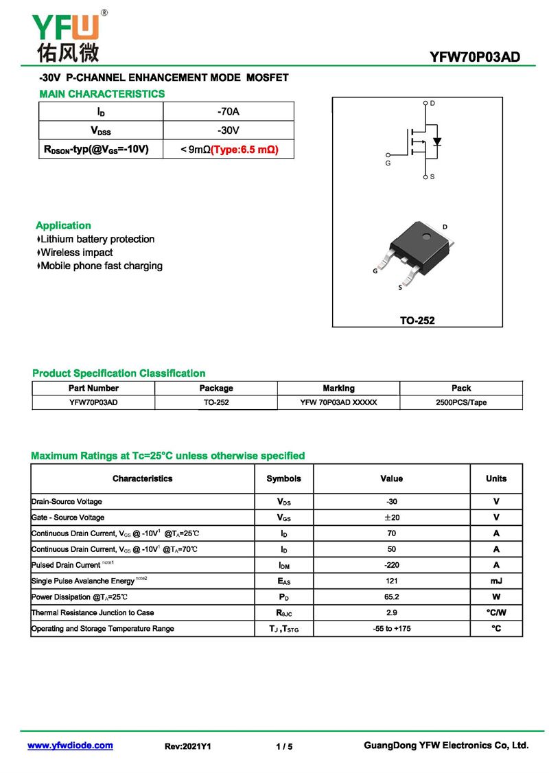場效應(yīng)管YFW70P03AD 規(guī)格書_價(jià)格_PDF手冊(cè)-廣東佑風(fēng)微原廠YFW70P03AD TO-252_(YFW佑風(fēng)微)品牌