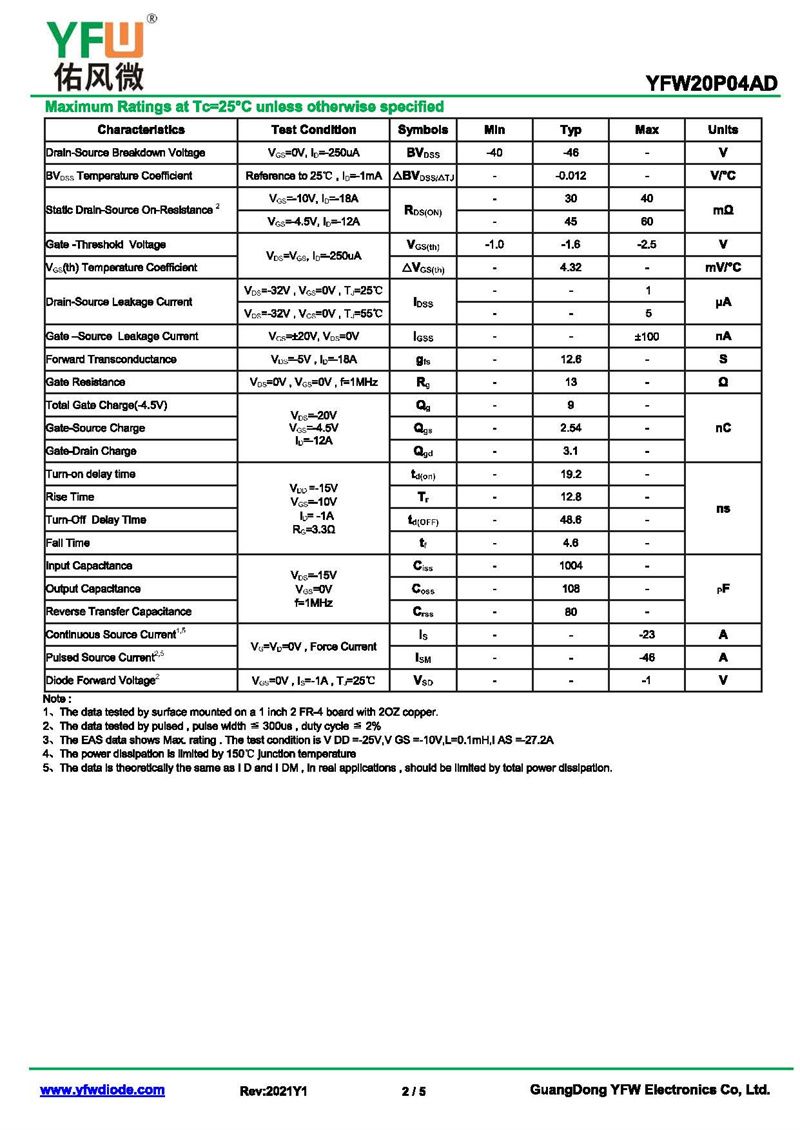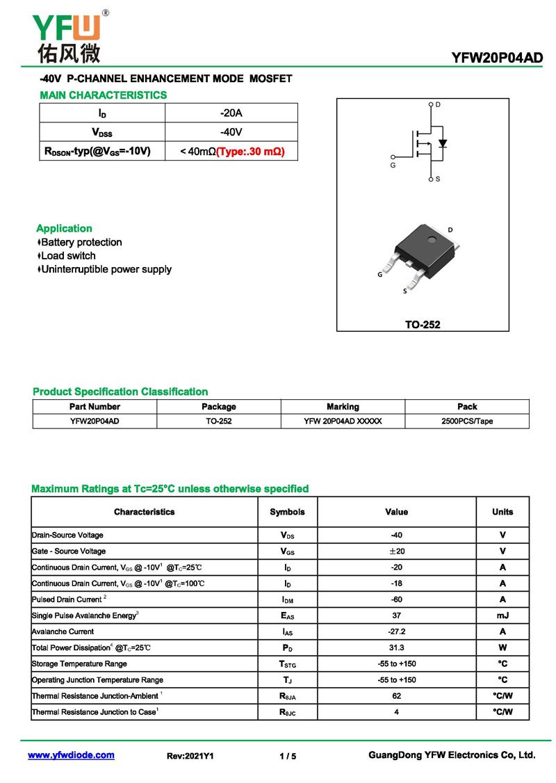 場效應管YFW20P04AD 規格書_價格_PDF手冊-廣東佑風微原廠YFW20P04AD TO-252_(YFW佑風微)品牌