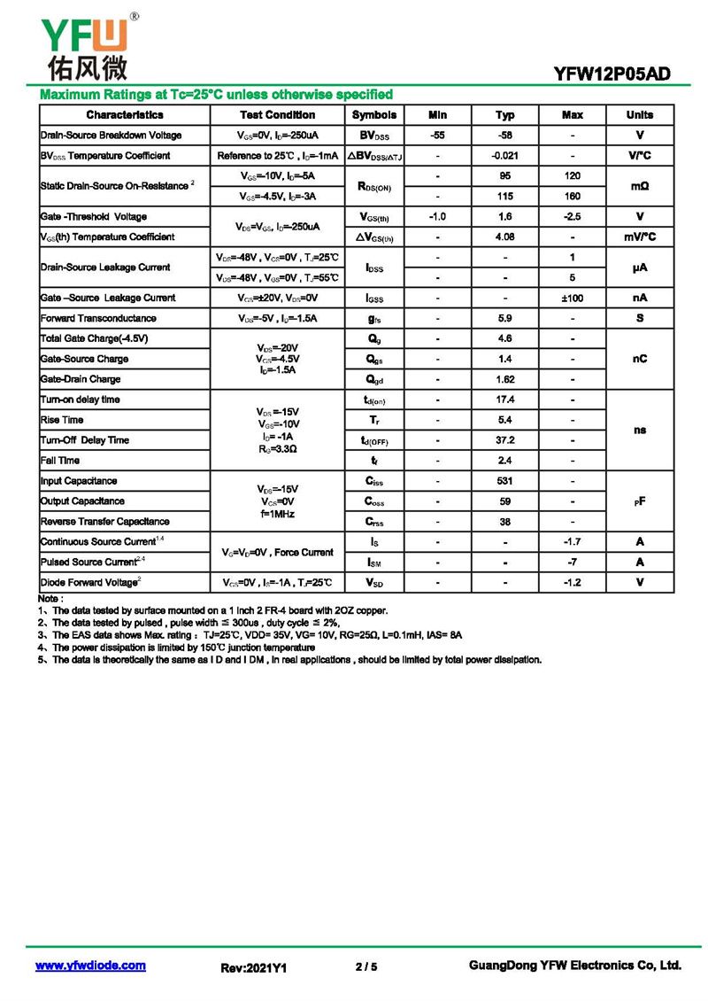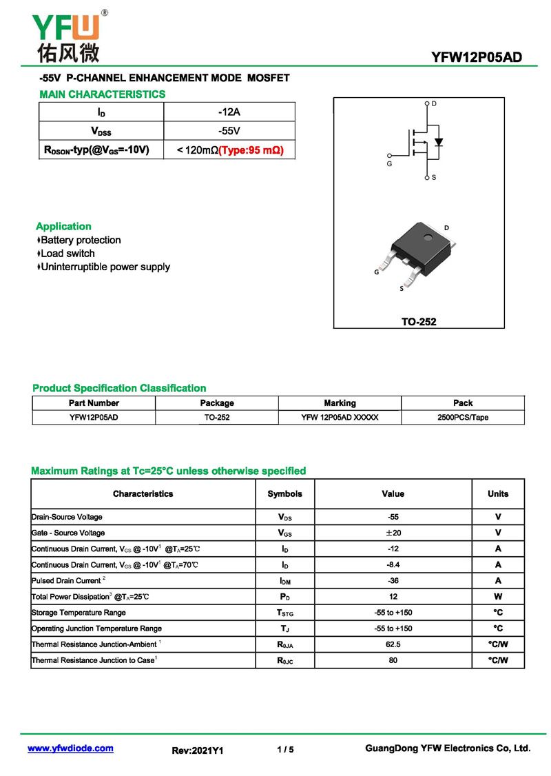 場效應管YFW12P05AD 規格書_價格_PDF手冊-廣東佑風微原廠YFW12P05AD TO-252_(YFW佑風微)品牌