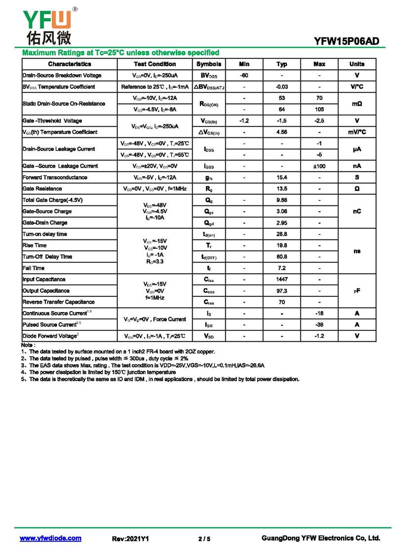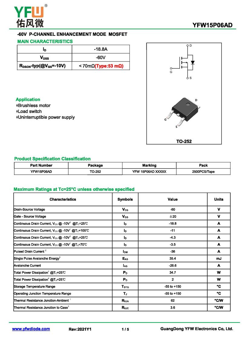 場效應管YFW15P06AD 規格書_價格_PDF手冊-廣東佑風微原廠YFW15P06AD TO-252_(YFW佑風微)品牌