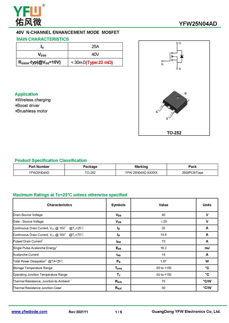 場效應管YFW25N04AD 規格書_價格_PDF手冊-廣東佑風微原廠YFW25N04AD TO-252_(YFW佑風微)品牌