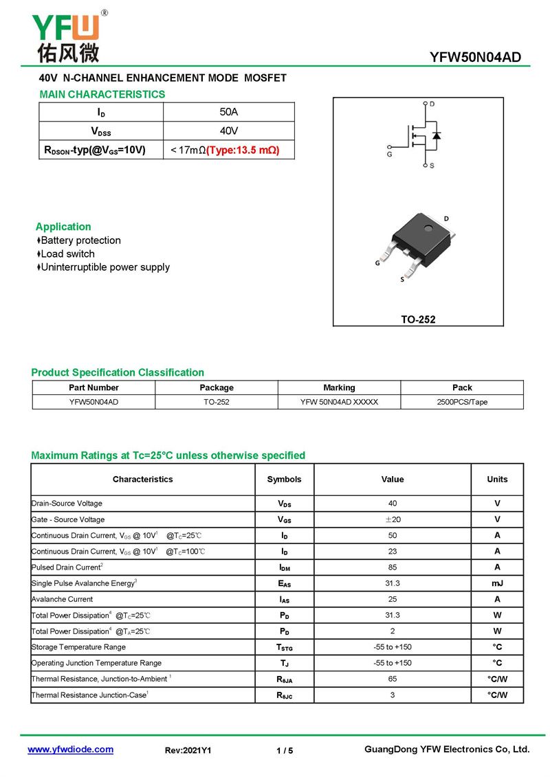 場效應管YFW50N04AD 規格書_價格_PDF手冊-廣東佑風微原廠YFW50N04AD TO-252_(YFW佑風微)品牌