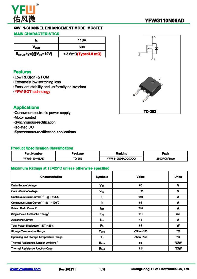 場(chǎng)效應(yīng)管YFWG110N06AD 規(guī)格書_價(jià)格_PDF手冊(cè)-廣東佑風(fēng)微原廠YFWG110N06AD TO-252_(YFW佑風(fēng)微)品牌