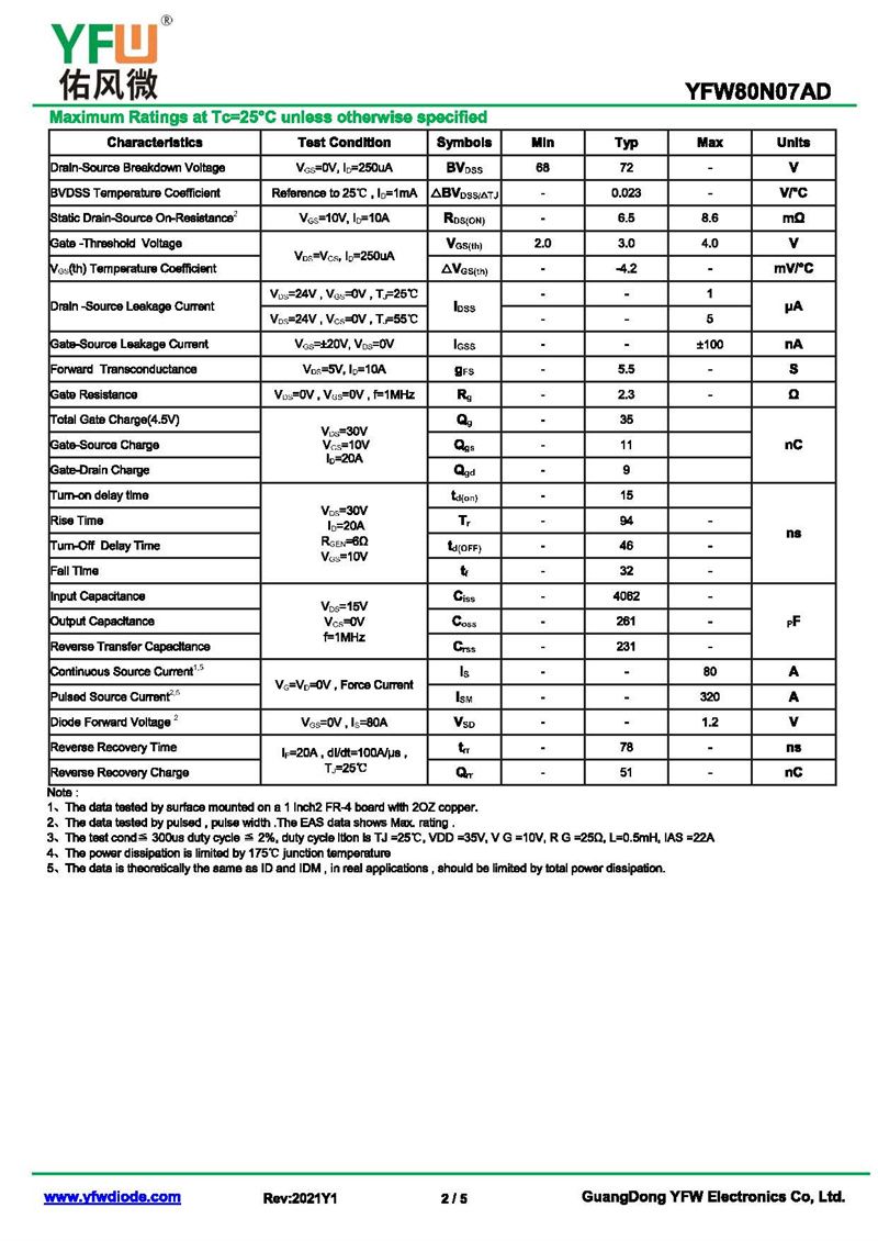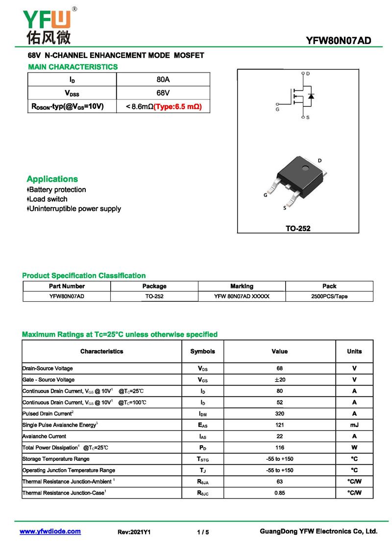 場效應管YFW80N07AD 規格書_價格_PDF手冊-廣東佑風微原廠YFW80N07AD TO-252_(YFW佑風微)品牌
