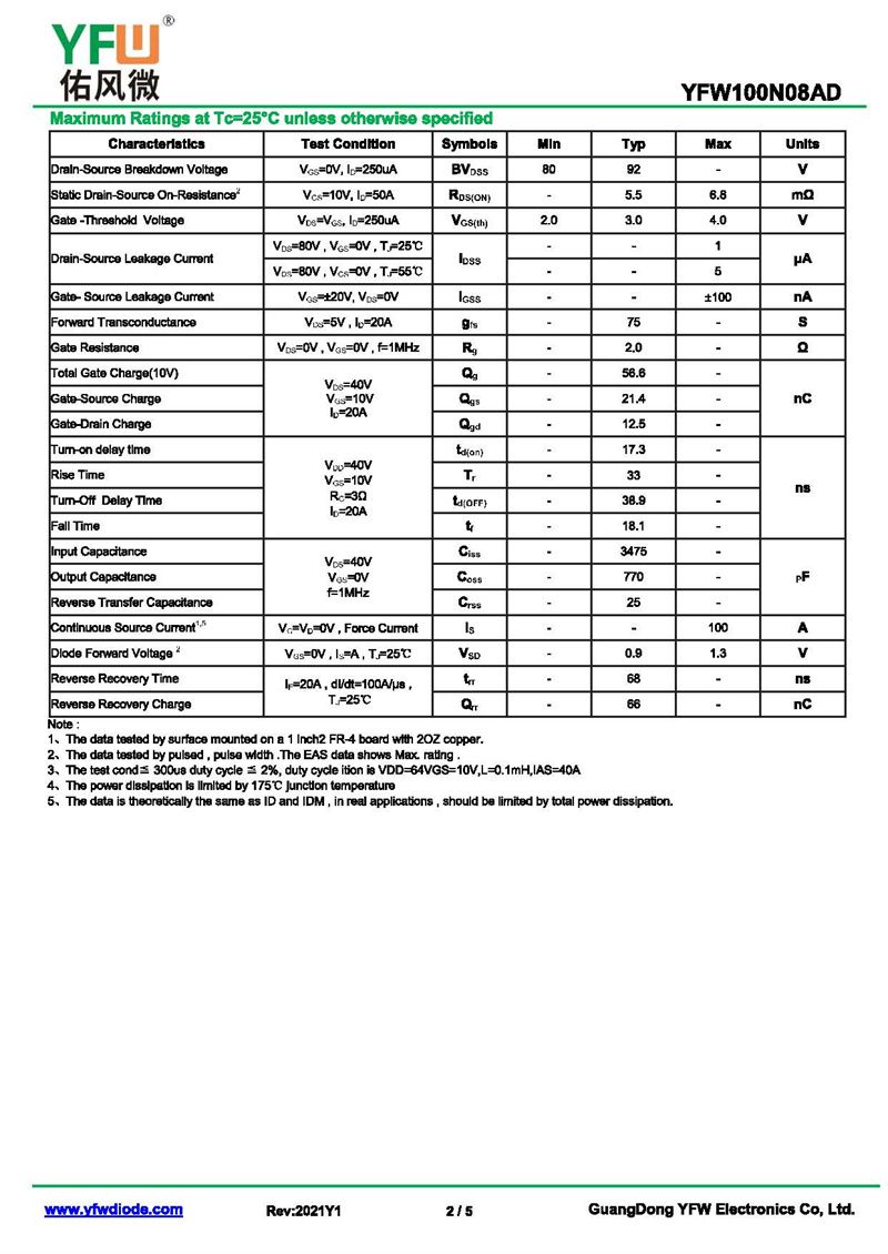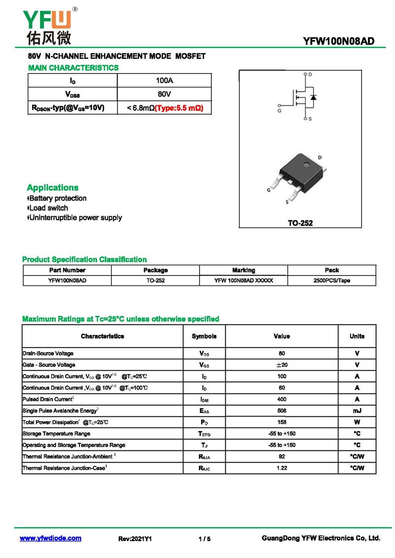 場效應管YFW100N08AD 規格書_價格_PDF手冊-廣東佑風微原廠YFW100N08AD TO-252_(YFW佑風微)品牌