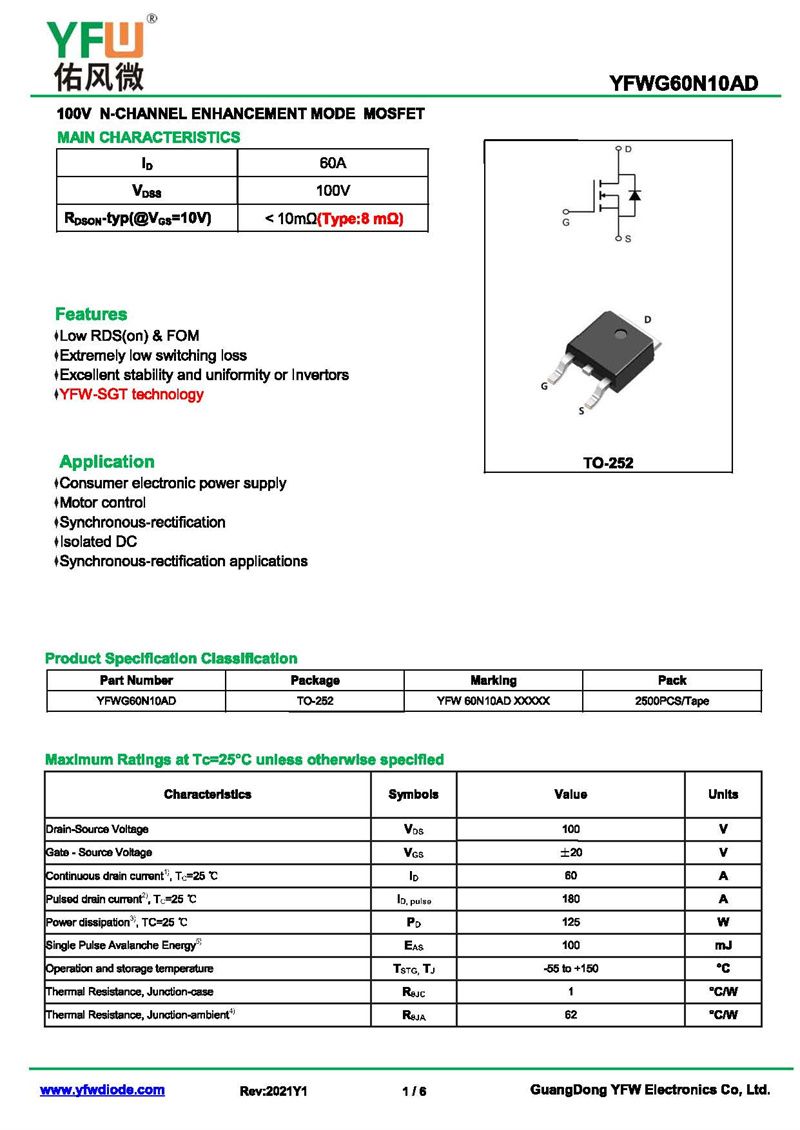 場效應管YFWG60N10AD 規(guī)格書_價格_PDF手冊-廣東佑風微原廠YFWG60N10AD TO-252_(YFW佑風微)品牌