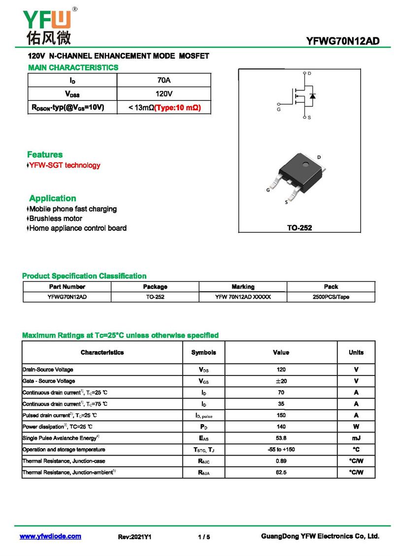 場效應管YFWG70N12AD 規格書_價格_PDF手冊-廣東佑風微原廠YFWG70N12AD TO-252_(YFW佑風微)品牌