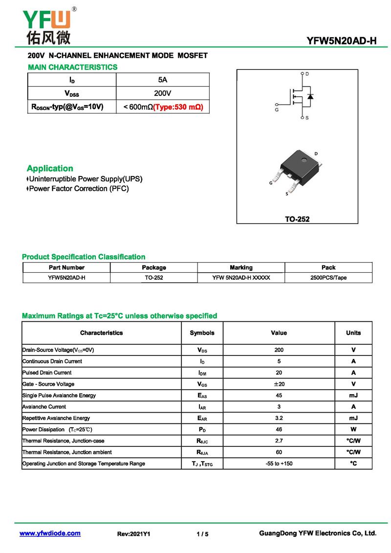 場效應管YFW5N20AD-H 規格書_價格_PDF手冊-廣東佑風微原廠YFW5N20AD-H TO-252_(YFW佑風微)品牌