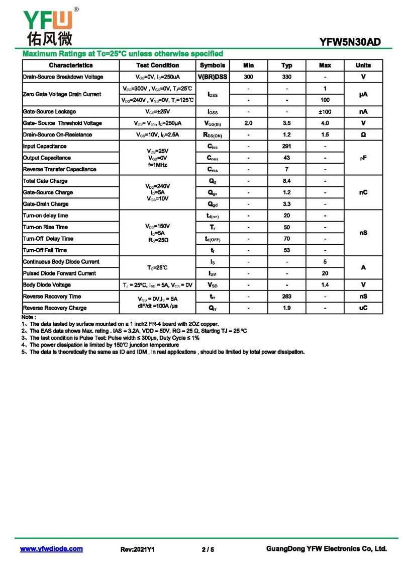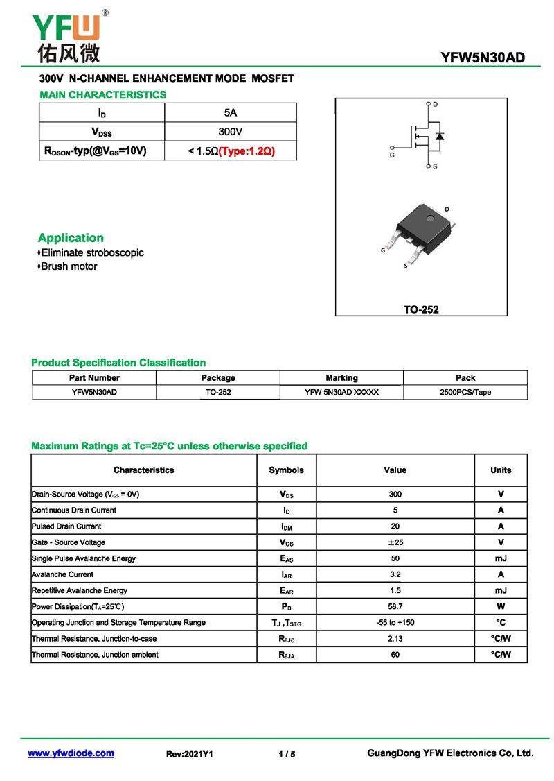 場效應管YFW5N30AD 規格書_價格_PDF手冊-廣東佑風微原廠YFW5N30AD TO-252_(YFW佑風微)品牌