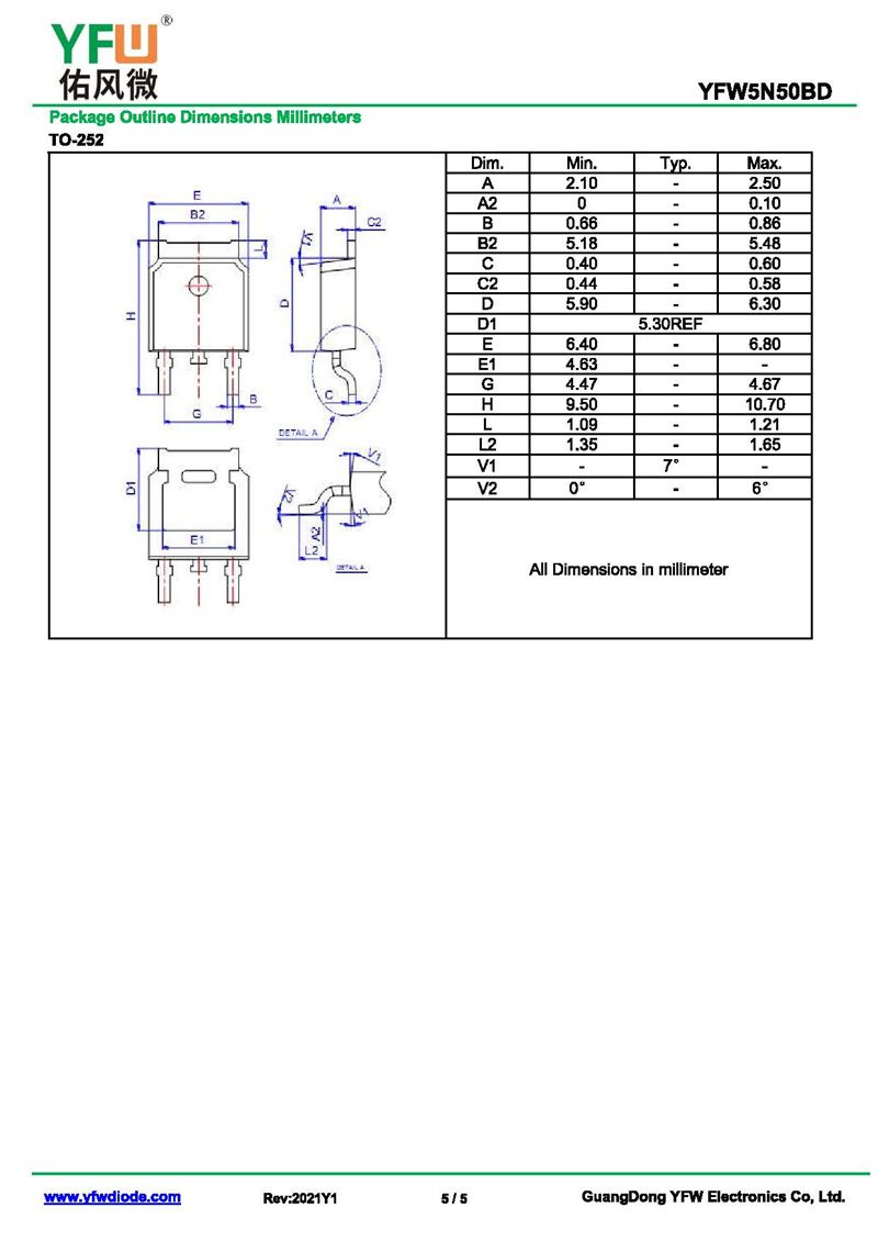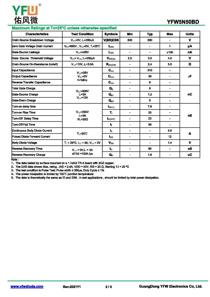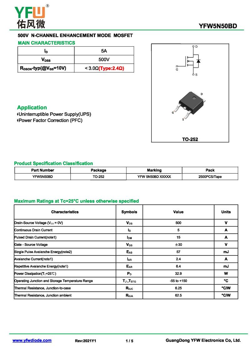 場效應(yīng)管YFW5N50BD 規(guī)格書_價格_PDF手冊-廣東佑風微原廠YFW5N50BD TO-252_(YFW佑風微)品牌