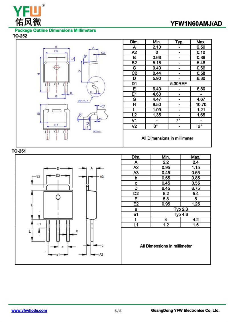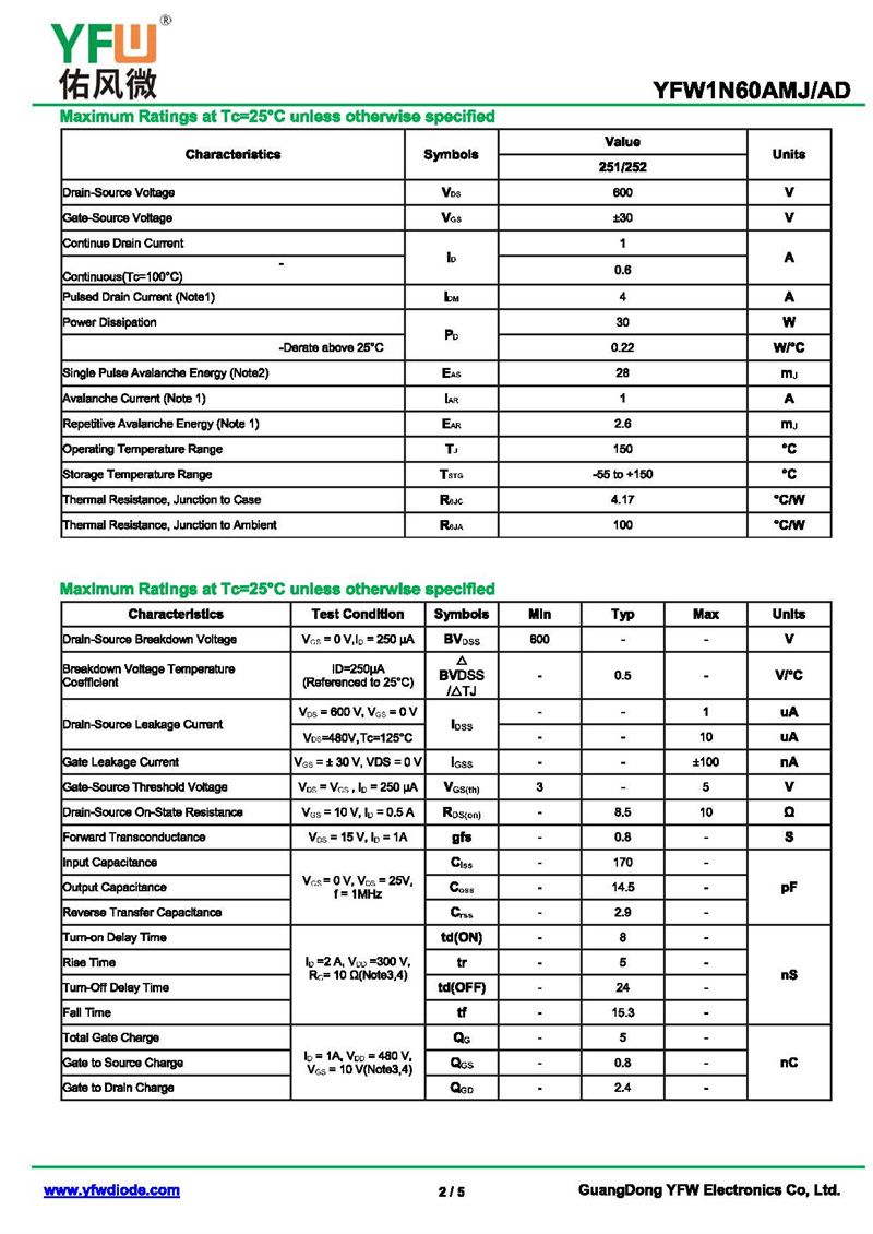 場效應管YFW1N60AD 規格書_價格_PDF手冊-廣東佑風微原廠YFW1N60AD TO-252_(YFW佑風微)品牌