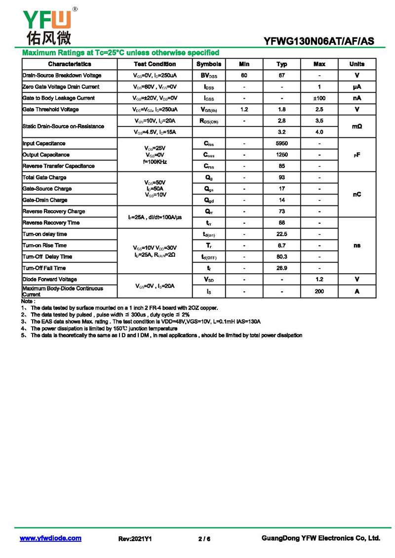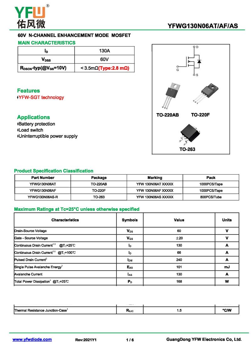 場效應管YFWG130N06AS-R 規格書_價格_PDF手冊-廣東佑風微原廠YFWG130N06AS-R TO-263_(YFW佑風微)品牌