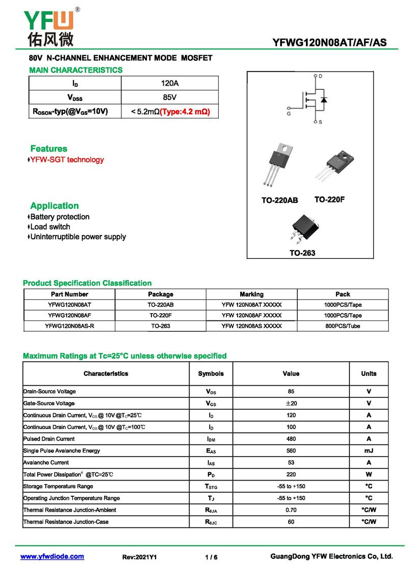 場效應(yīng)管YFWG120N08AS-R 規(guī)格書_價格_PDF手冊-廣東佑風(fēng)微原廠YFWG120N08AS-R TO-263_(YFW佑風(fēng)微)品牌