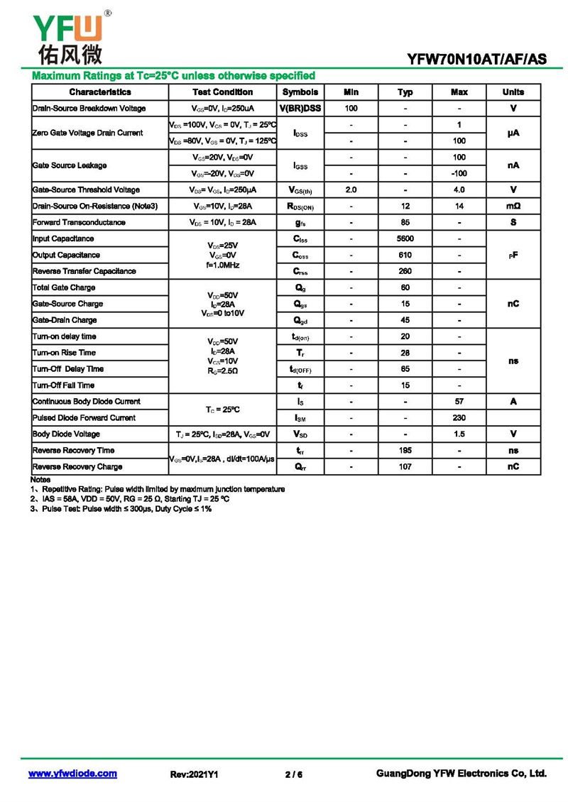 場效應管YFW70N10AS-R 規格書_價格_PDF手冊-廣東佑風微原廠YFW70N10AS-R TO-263_(YFW佑風微)品牌